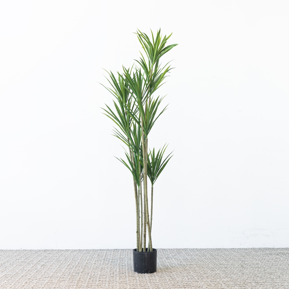 Planta artificial tipo Dracaena en maceta negra. Sus tallos altos y estilizados añaden frescura y verticalidad a cualquier espacio. Ideal para decorar interiores con un toque natural sin necesidad de mantenimiento.