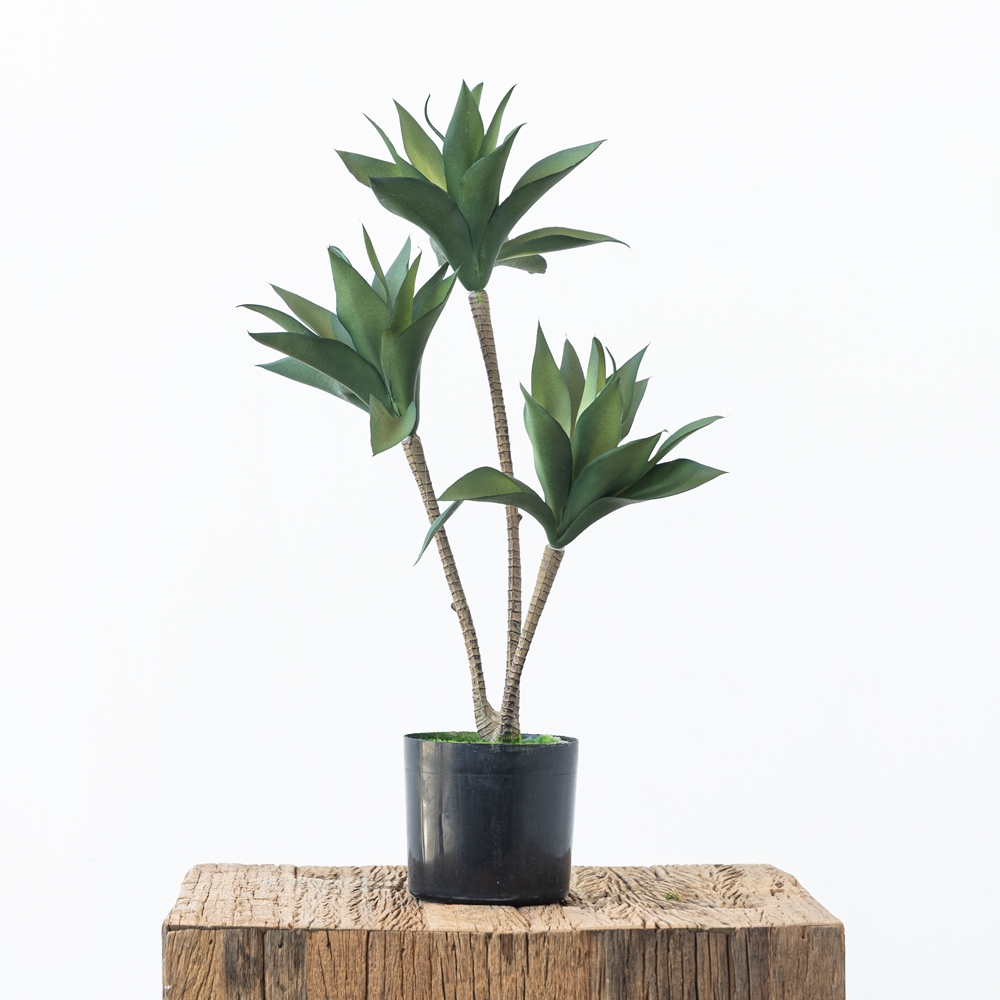 Planta artificial tipo agave con tres tallos estilizados y rosetas de hojas verdes de apariencia natural. Su forma escultural aporta un toque moderno y desértico a cualquier espacio interior. Ideal para decorar con personalidad sin necesidad de riego ni cuidados especiales.