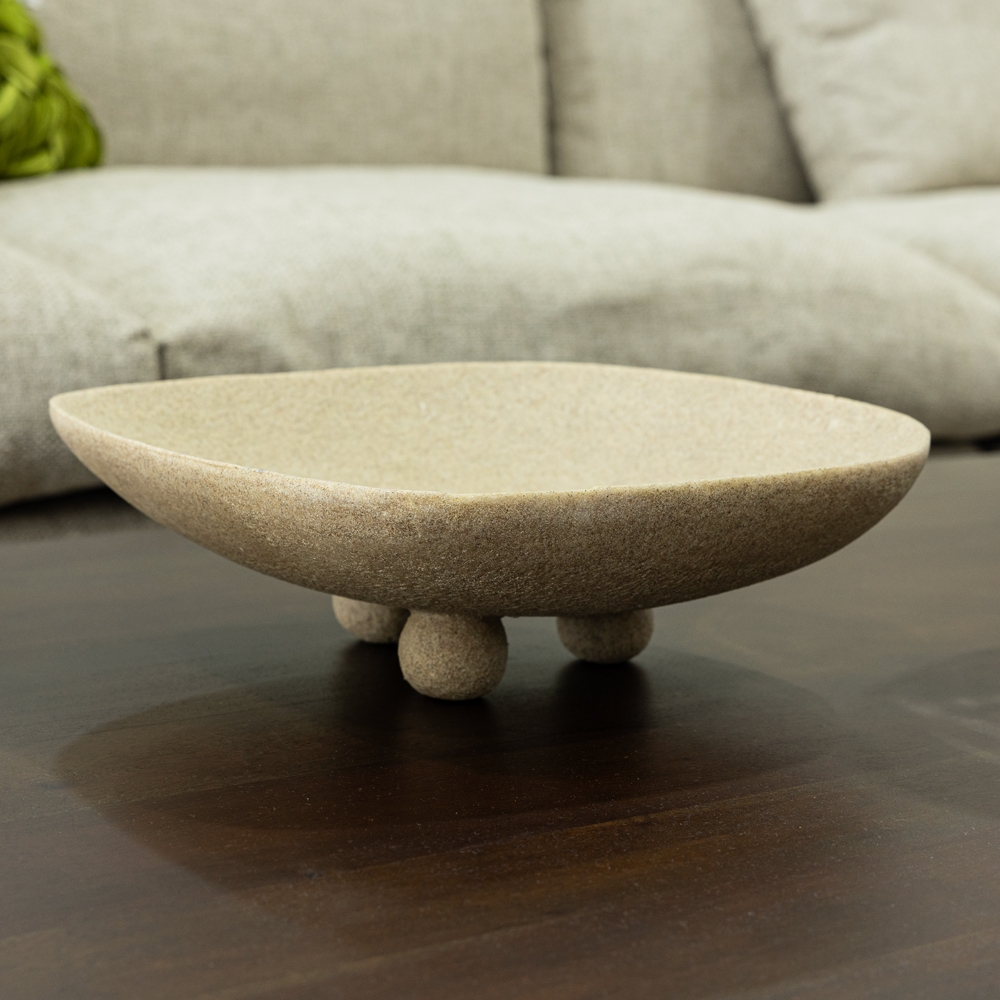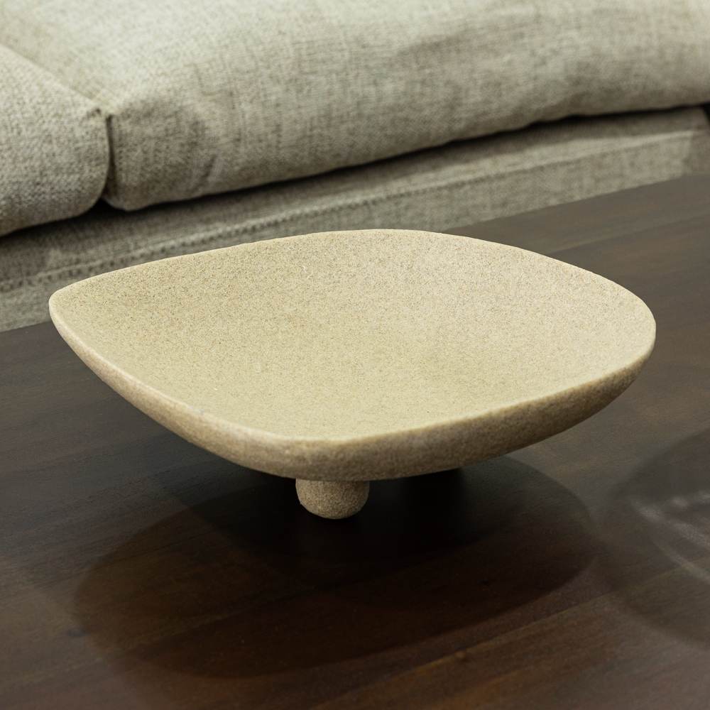 Hecho de material con textura tipo piedra, este centro de mesa combina líneas suaves y base de tres patas redondeadas. Su diseño minimalista y orgánico aporta un toque natural y contemporáneo a cualquier espacio.