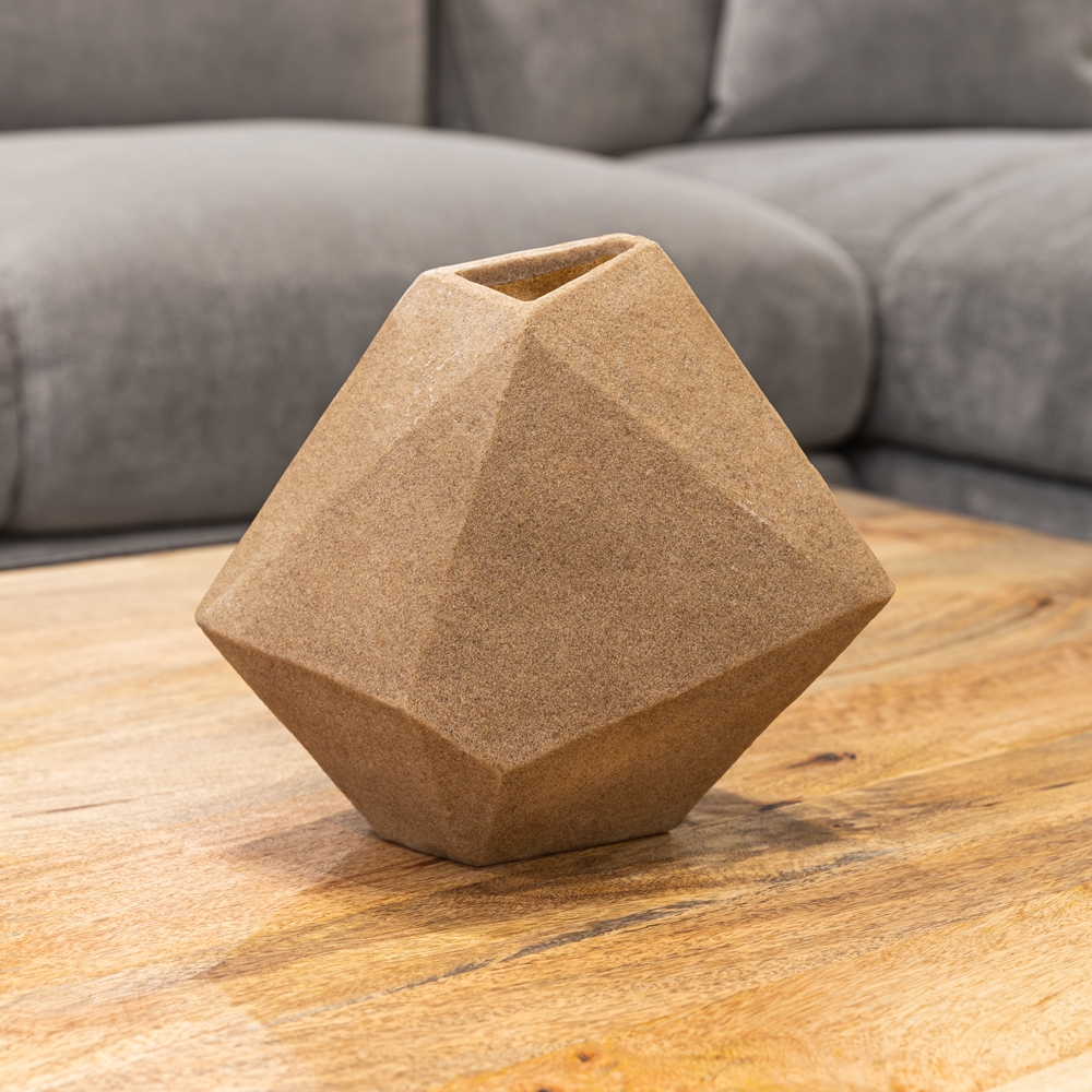 Florero geométrico en tono arena, elaborado en cerámica con acabado mate. Su diseño facetado aporta un toque moderno y minimalista a cualquier espacio. Ideal para decorar mesas, repisas o combinar con otros accesorios decorativos.
