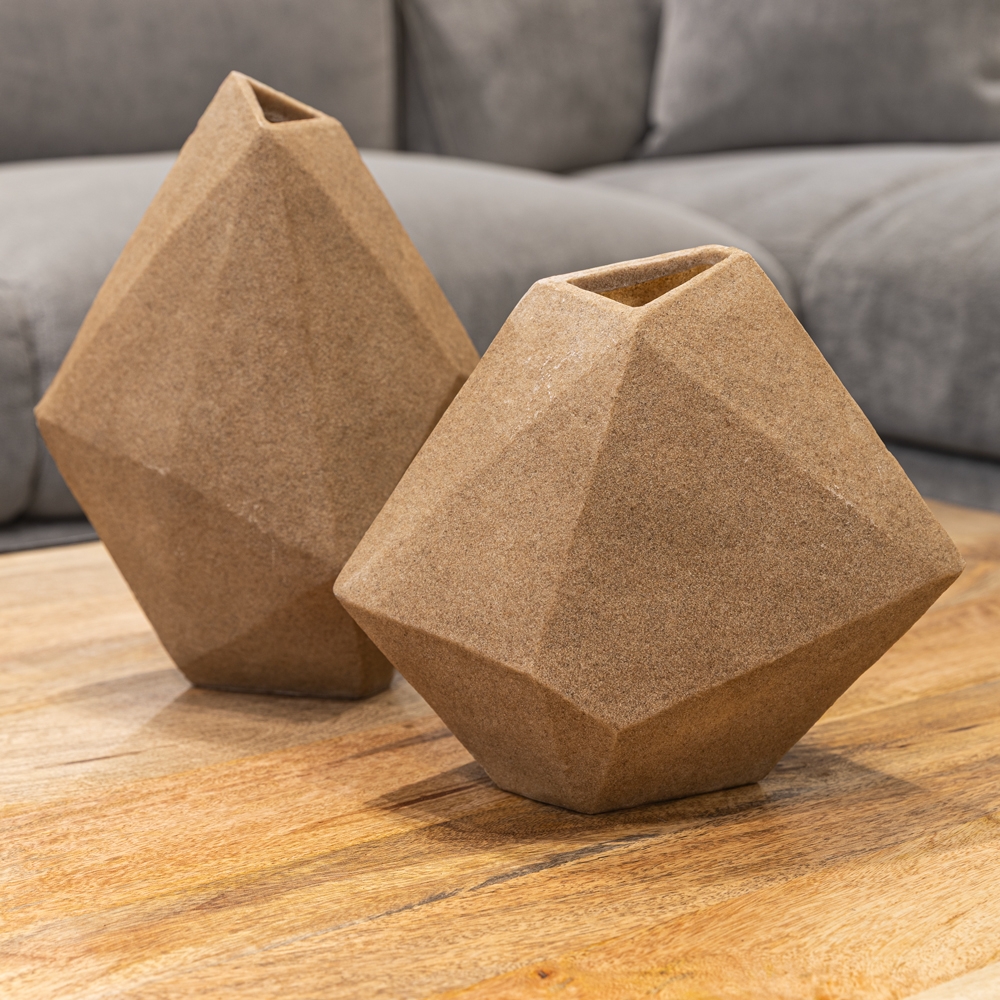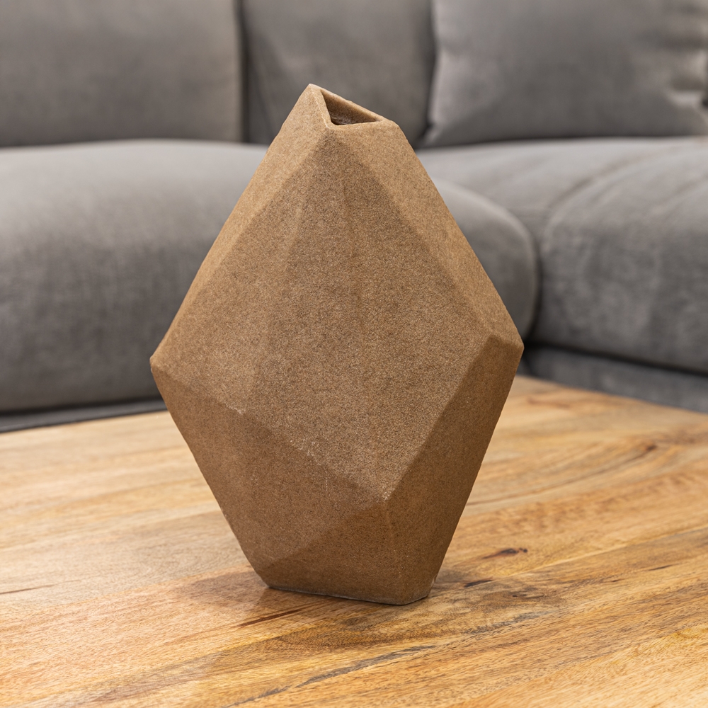 Florero geométrico en tono arena, elaborado en cerámica con acabado mate. Su diseño facetado aporta un toque moderno y minimalista a cualquier espacio. Ideal para decorar mesas, repisas o combinar con otros accesorios decorativos.