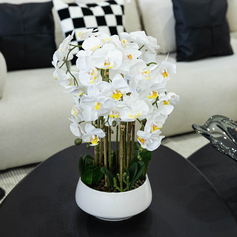 Arreglo de orquídeas blancas artificiales en base de cerámica blanca. Su diseño elegante y realista aporta frescura y sofisticación a cualquier espacio. Ideal para decorar salas, comedores o recibidores con un toque natural y moderno.