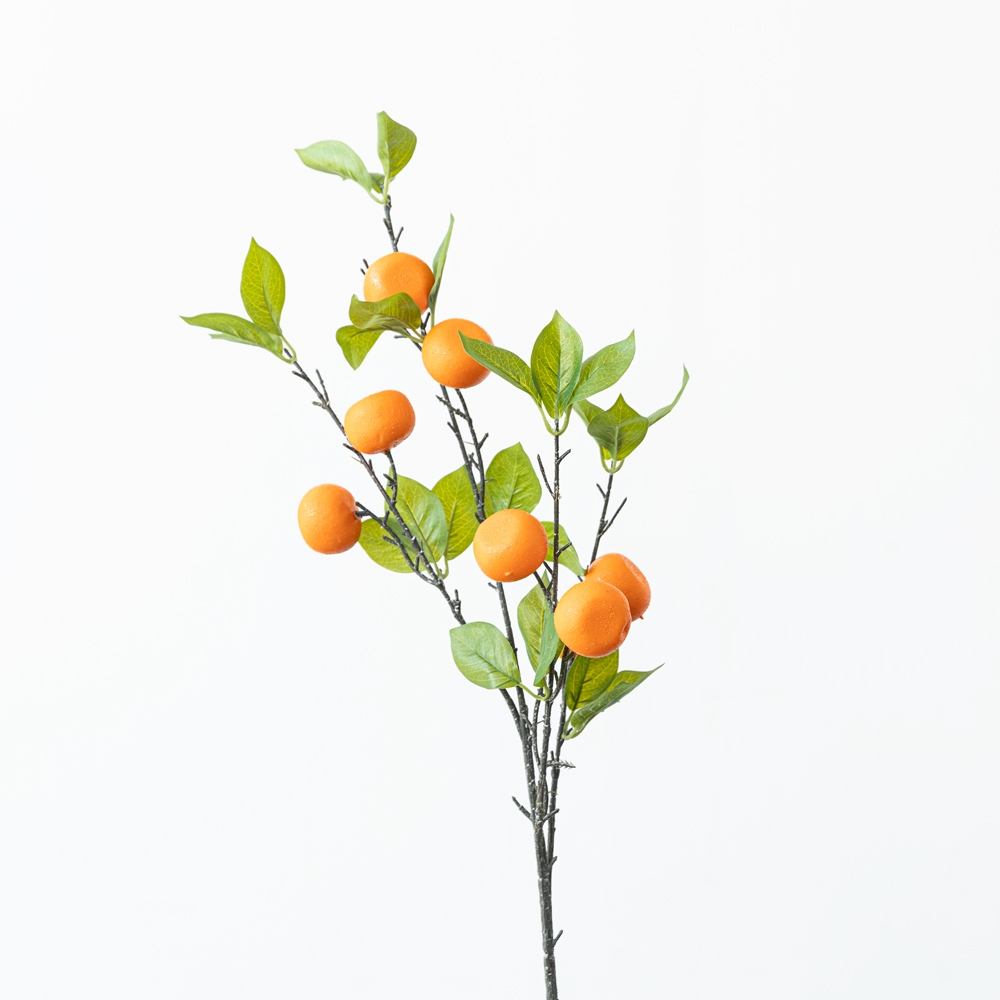 Rama decorativa de naranjo artificial con frutos en tonos vibrantes y hojas de acabado natural. Ideal para arreglos florales, centros de mesa o jarrones que buscan un toque fresco y colorido. Perfecta para añadir un aire mediterráneo sin necesidad de mantenimiento.
