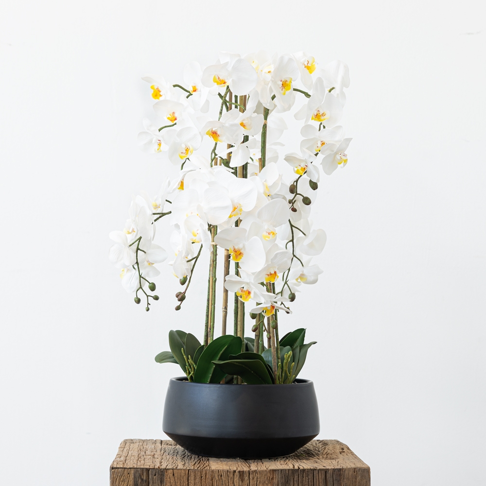 Elegante arreglo de orquídeas blancas en maceta negra, ideal para dar un toque sofisticado a cualquier espacio.
