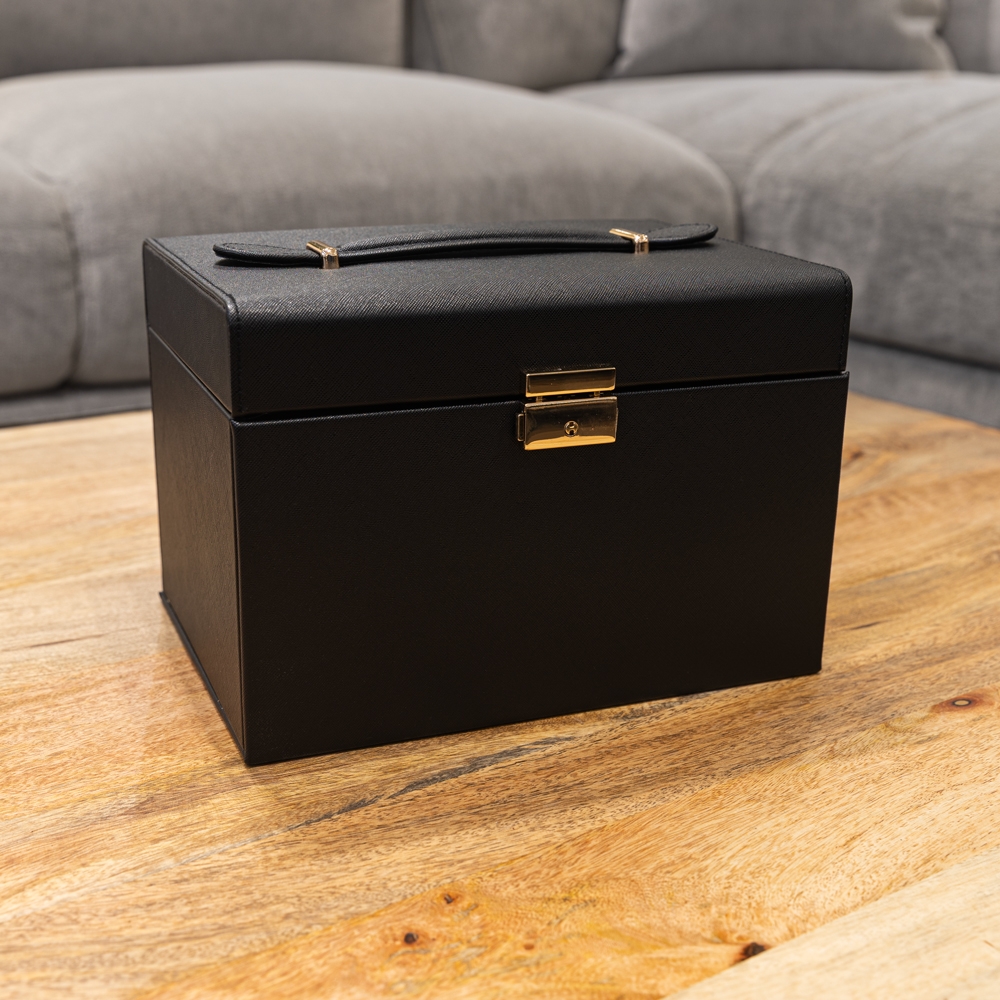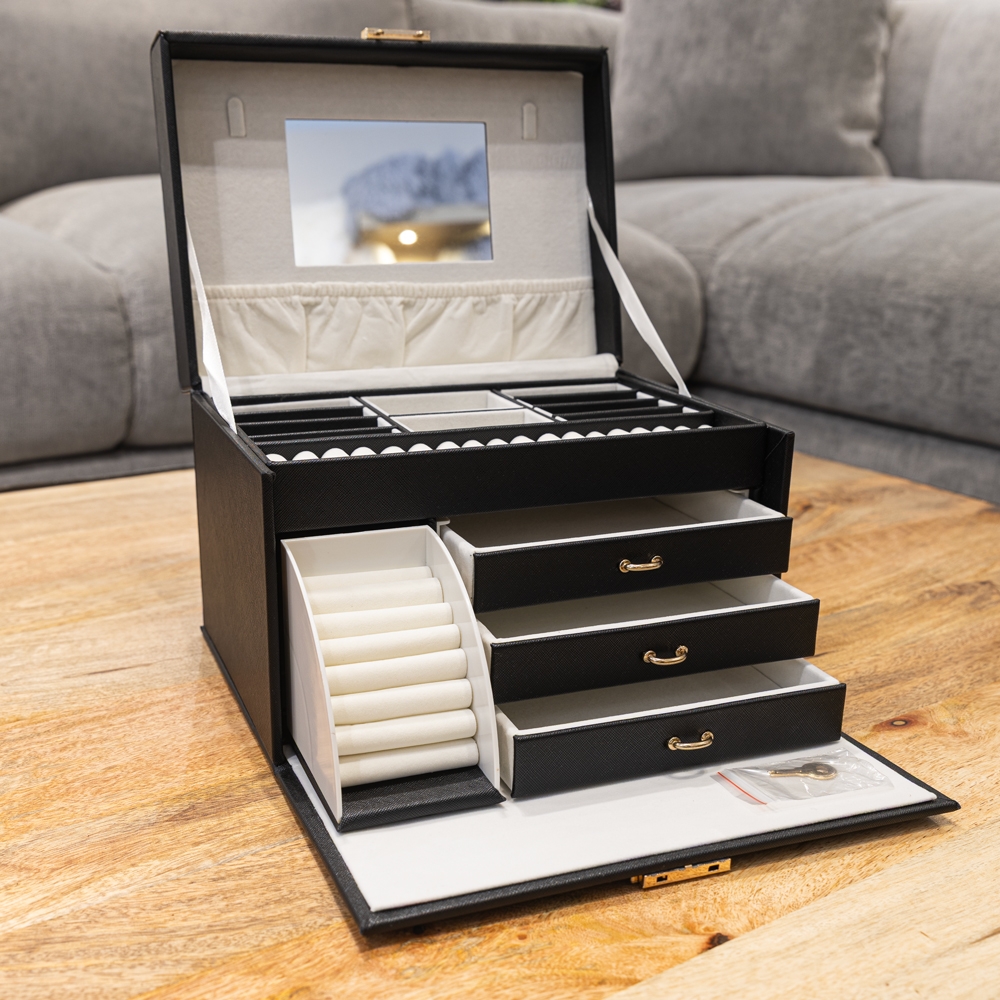 Joyero elegante con espejo interior y múltiples compartimentos. Incluye cajones, ganchos y secciones acolchadas para mantener tus joyas organizadas. Su diseño sofisticado y acabado de lujo lo hacen ideal para cualquier tocador.