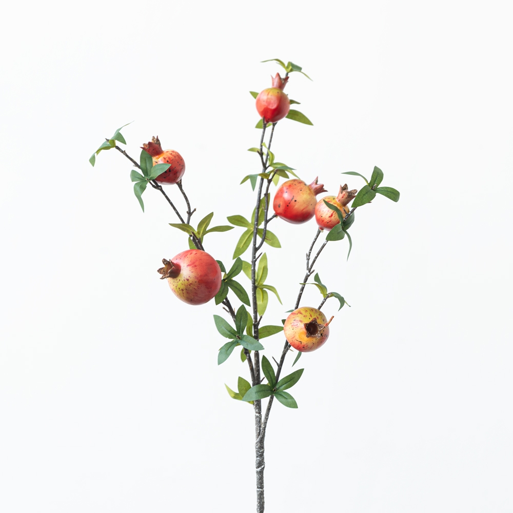 Rama decorativa de granada artificial con frutos rojizos de acabado realista y hojas detalladas.