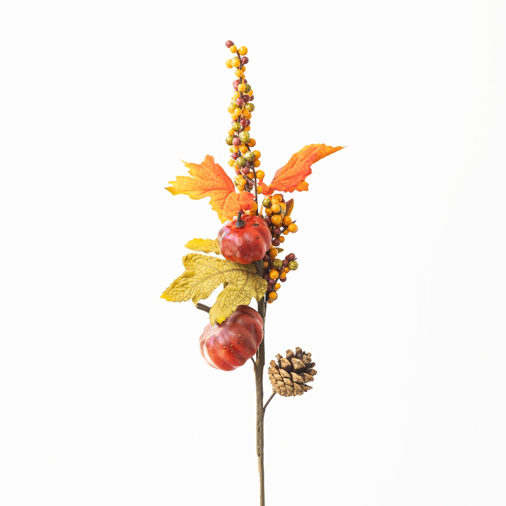 Varilla decorativa otoñal con hojas en tonos cálidos, pequeñas calabazas, bayas y una piña detallada. Aporta textura y color perfecto para arreglos estacionales, coronas y decoraciones temáticas. Ideal para añadir un toque acogedor sin mantenimiento.