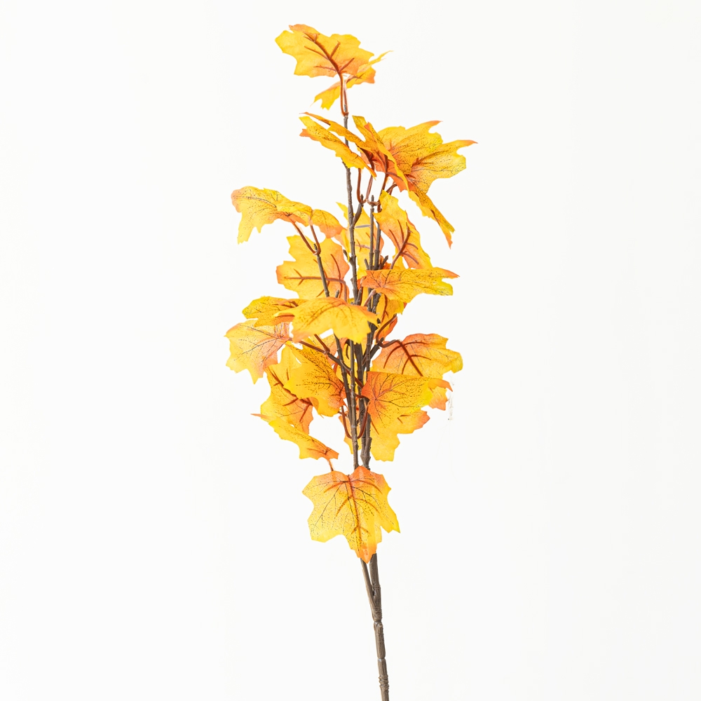 Varilla artificial de hojas otoñales en vibrantes tonos amarillos y naranjas, con detalles realistas que aportan calidez y textura. Ideal para arreglos estacionales, floreros y decoraciones temáticas. Perfecta para crear ambientes acogedores sin mantenimiento.