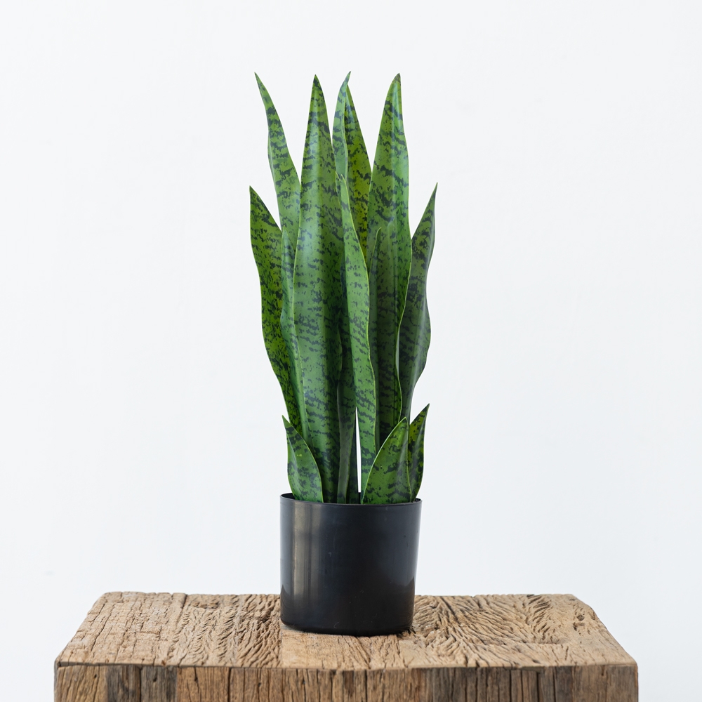Lengua de suegra artificial con hojas altas, firmes y moteadas en tonos verdes naturales.