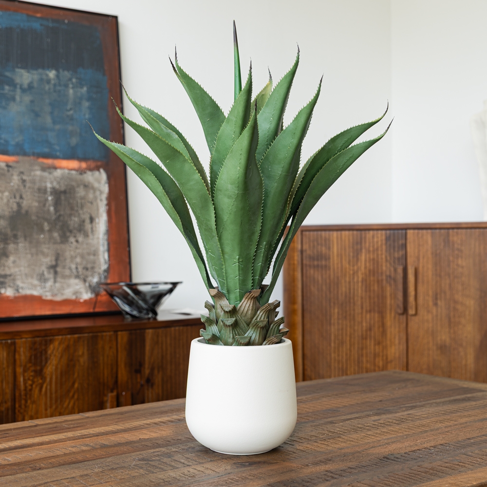 Planta decorativa tipo agave en maceta blanca, ideal para aportar un toque moderno y natural a cualquier espacio. Sus hojas robustas y detalladas ofrecen un estilo fresco y contemporáneo. Perfecta para mesas, repisas o rincones que buscan un acento verde con personalidad.
