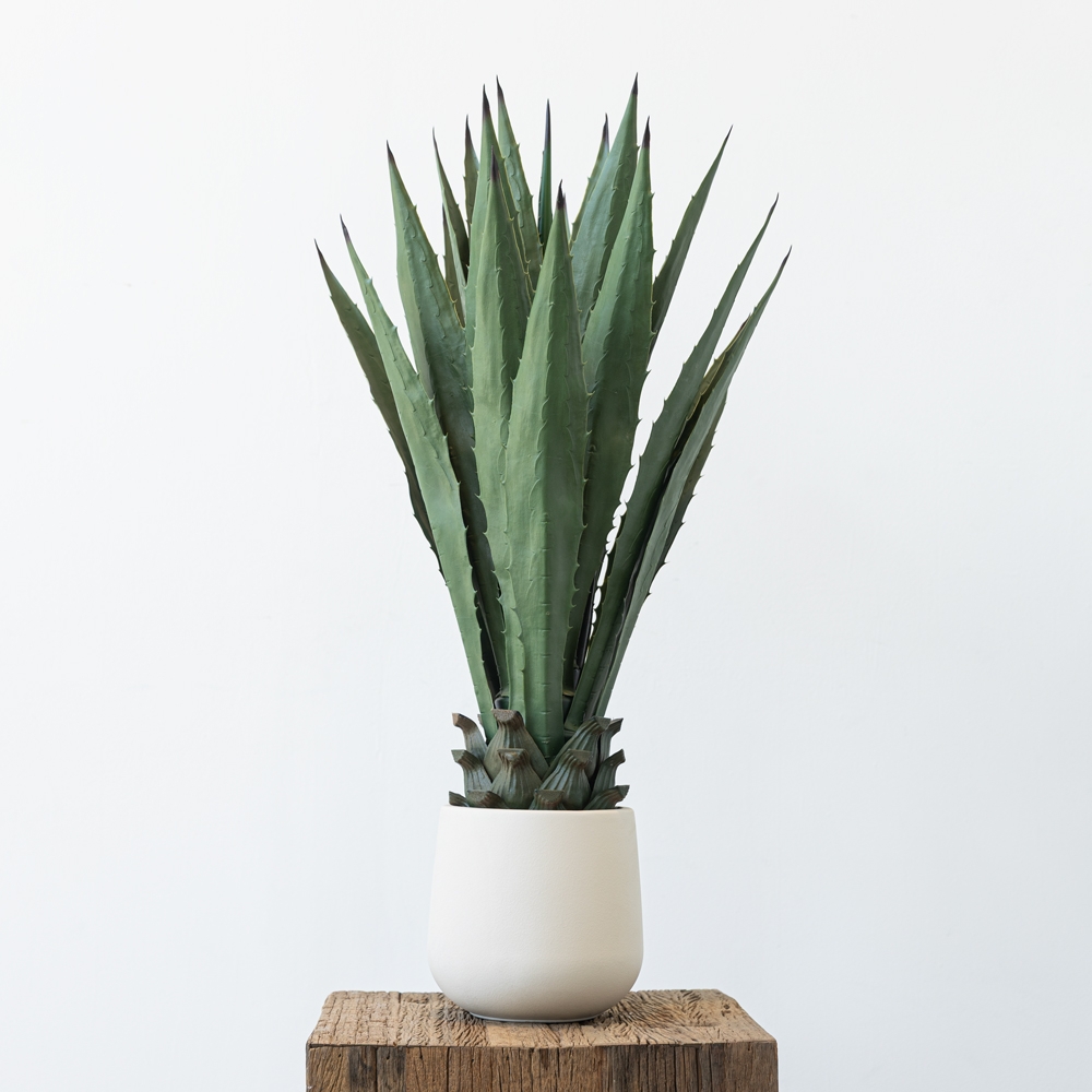 Agave artificial de porte alto con hojas rígidas y texturizadas en tonos verdes naturales. Viene en una maceta cerámica clara que aporta un toque moderno y elegante al conjunto. Ideal para decoraciones contemporáneas que buscan un acento desértico sin mantenimiento.
