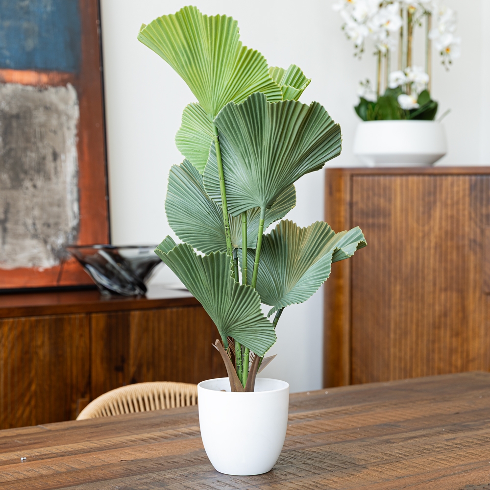 Planta decorativa de hojas tipo abanico en maceta blanca, perfecta para añadir frescura y elegancia natural al hogar. Sus hojas amplias y texturizadas aportan un toque moderno y llamativo. Ideal para mesas, repisas o rincones que necesitan un acento verde sofisticado.