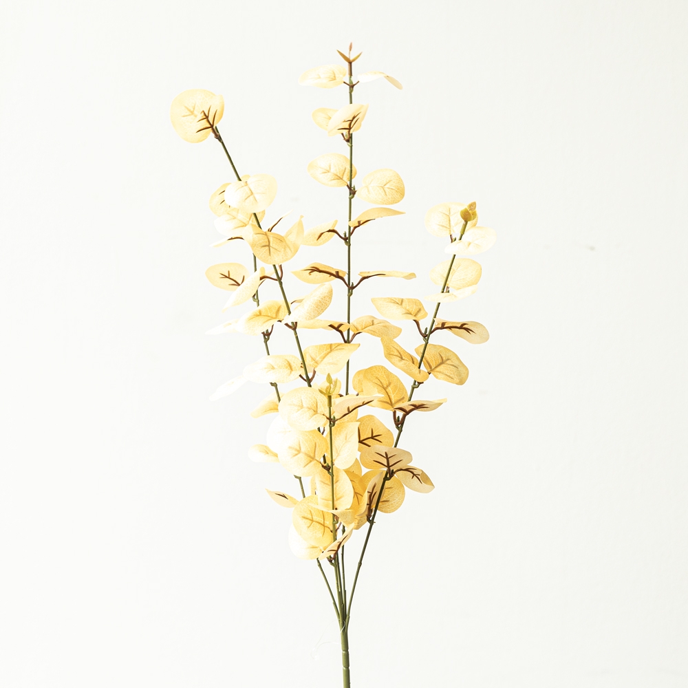 Rama artificial decorativa con hojas redondeadas en tono amarillo suave, perfecta para aportar luz y un toque cálido a tus arreglos florales. Su textura detallada y acabado natural la hacen ideal para jarrones, centros de mesa o composiciones modernas. Una pieza versátil que ilumina y embellece cualquier espacio.