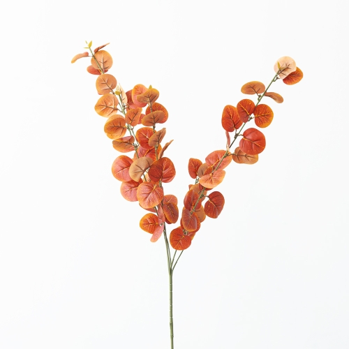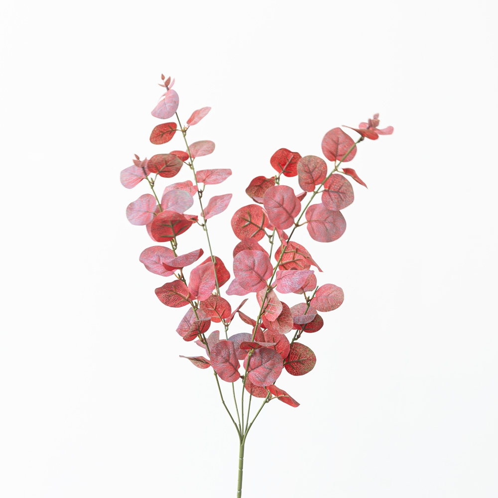Rama artificial de eucalipto en tonos rojo vibrante, con hojas redondeadas y detalles realistas que añaden impacto visual. Ideal para arreglos decorativos, floreros y composiciones temáticas. Perfecta para dar un toque audaz y sin mantenimiento.