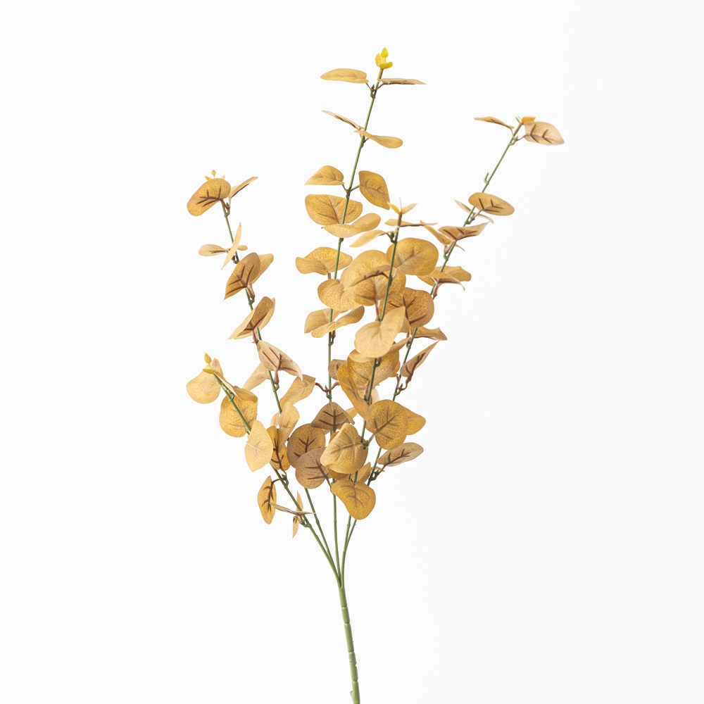 Rama artificial de eucalipto en tonos dorados, con hojas redondeadas y detalles realistas que aportan calidez y estilo. Ideal para arreglos estacionales, floreros y composiciones decorativas. Perfecta para añadir un toque elegante sin mantenimiento.