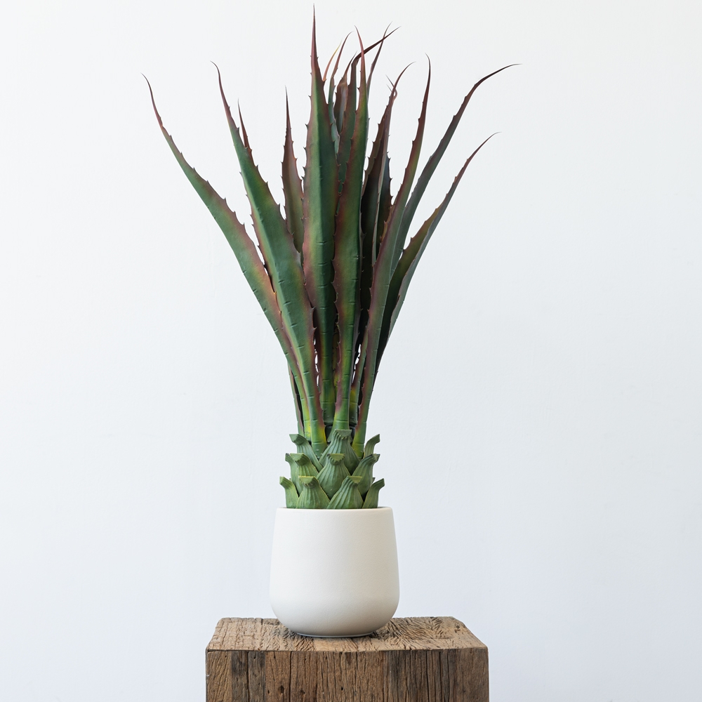 Agave artificial de porte alto con hojas rígidas y texturizadas en tonos verdes naturales. Viene en una maceta cerámica clara que aporta un toque moderno y elegante al conjunto. Ideal para decoraciones contemporáneas que buscan un acento desértico sin mantenimiento.