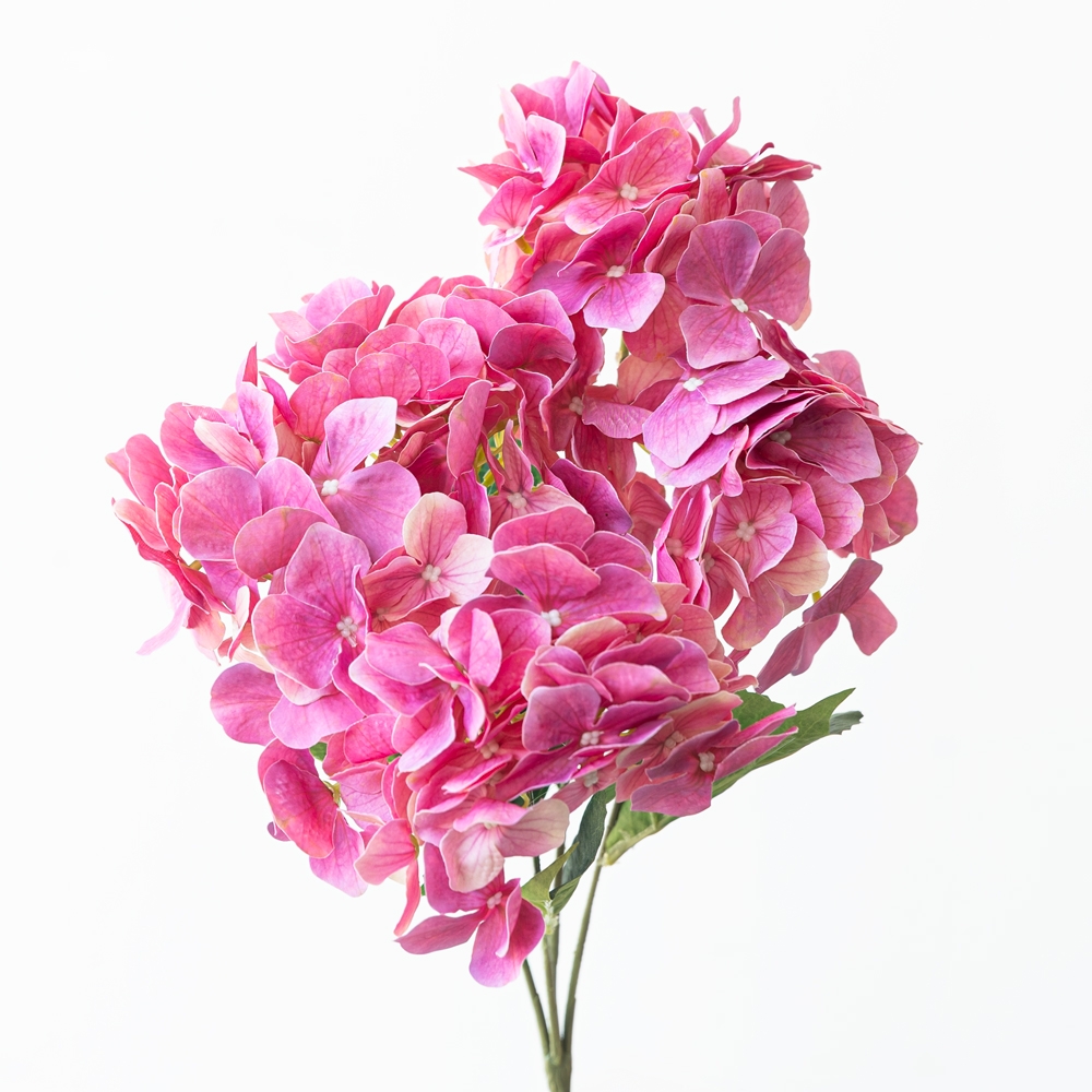 Ramillete artificial de hortensias en tonos fucsia, con pétalos suaves y un acabado realista que aporta volumen y calidez. Ideal para floreros, arreglos decorativos y espacios elegantes. Perfecto para dar un toque floral sin mantenimiento.