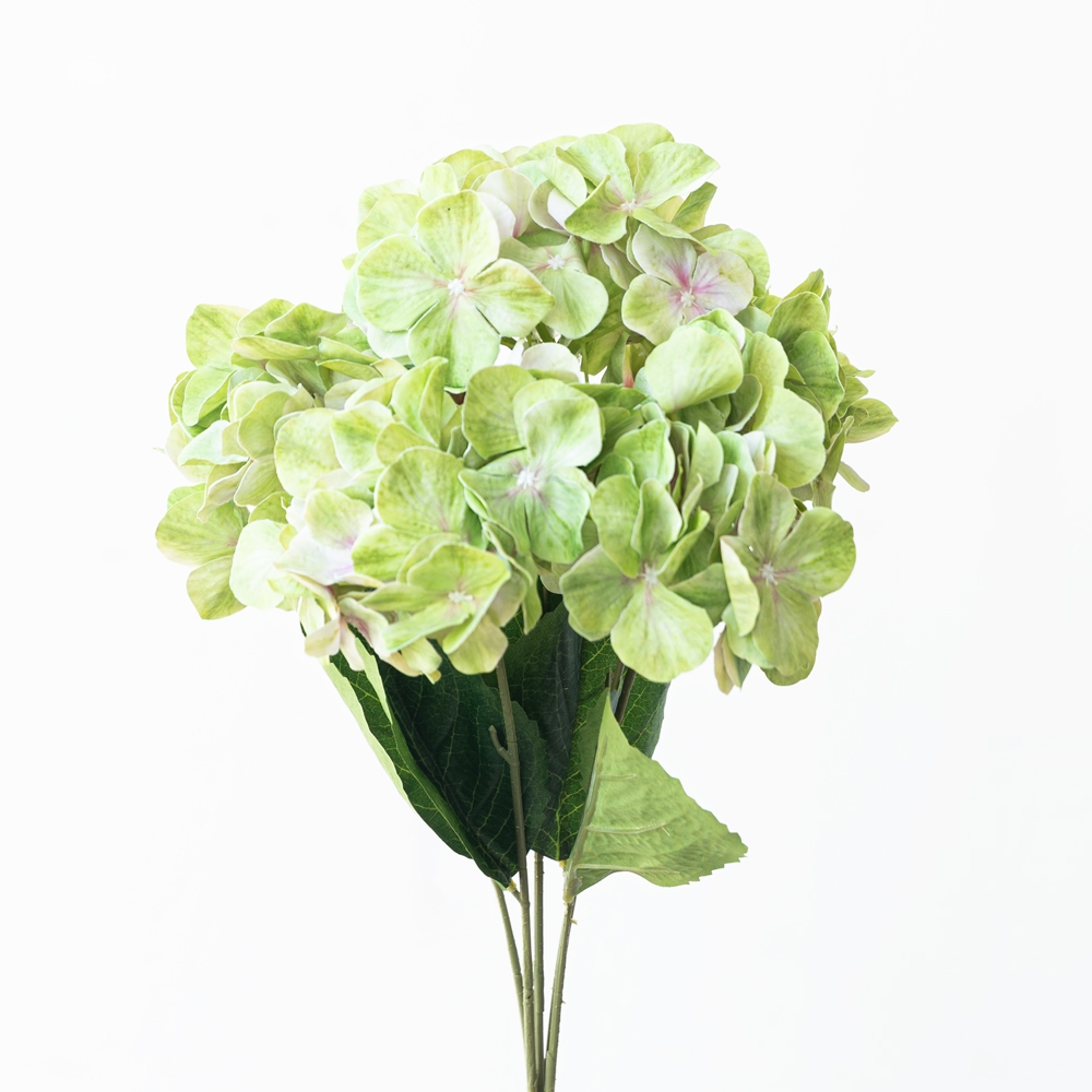 Ramillete artificial de hortensias en tonos verde suave, con pétalos delicados y un acabado realista que aporta volumen y frescura. Ideal para floreros, arreglos decorativos y ambientes elegantes. Perfecto para añadir un toque natural sin mantenimiento.