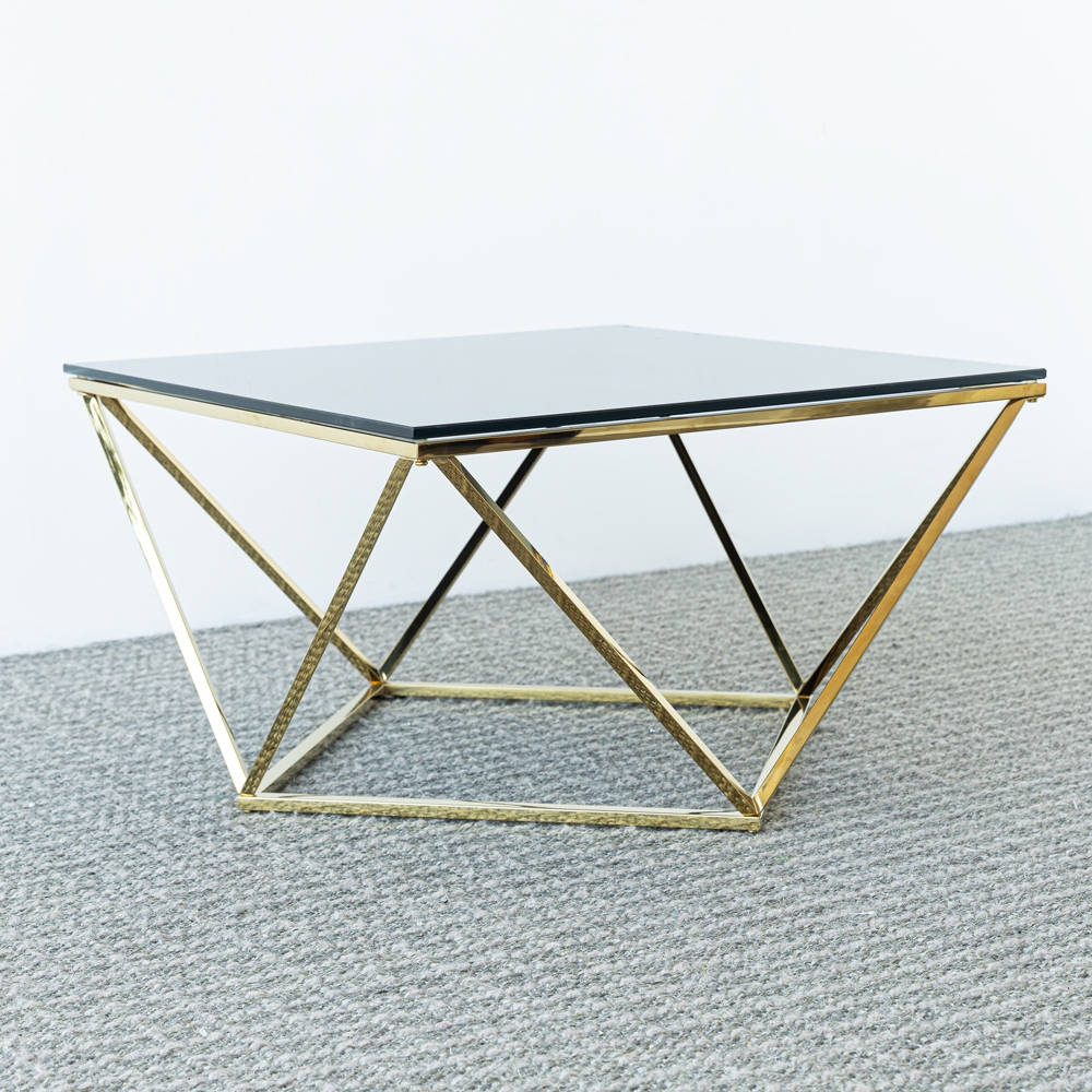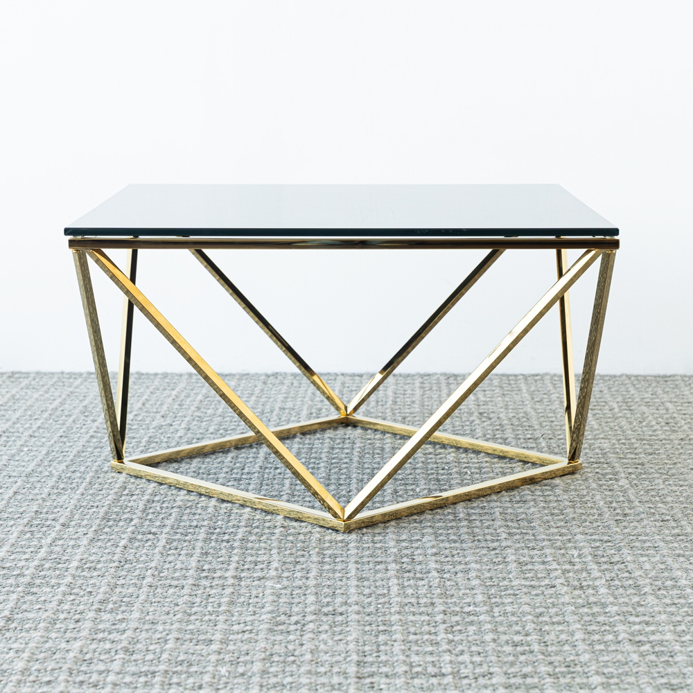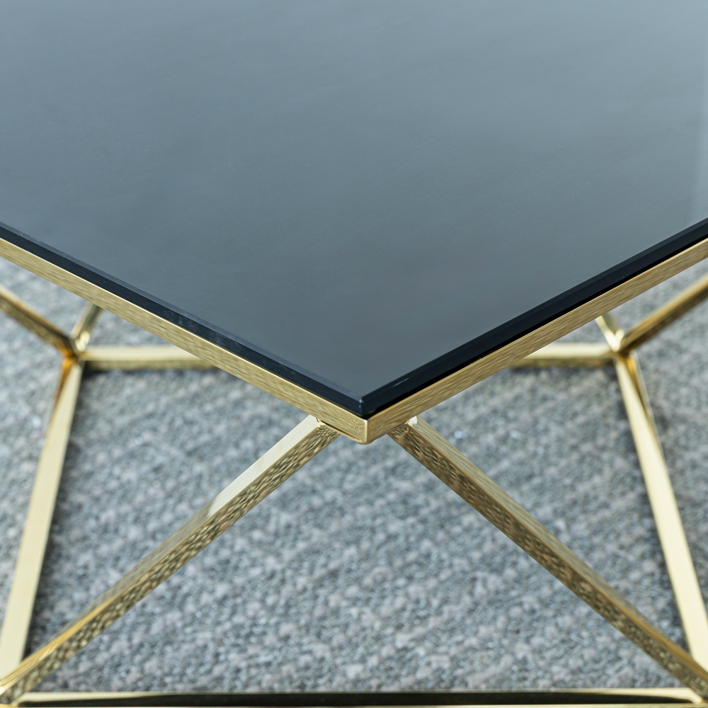 Esta mesa destaca por su base geométrica en acabado dorado que aporta elegancia y modernidad a cualquier espacio. Su cubierta de vidrio oscuro añade un toque sofisticado y minimalista. Ideal para salas que buscan un acento decorativo contemporáneo y llamativo.