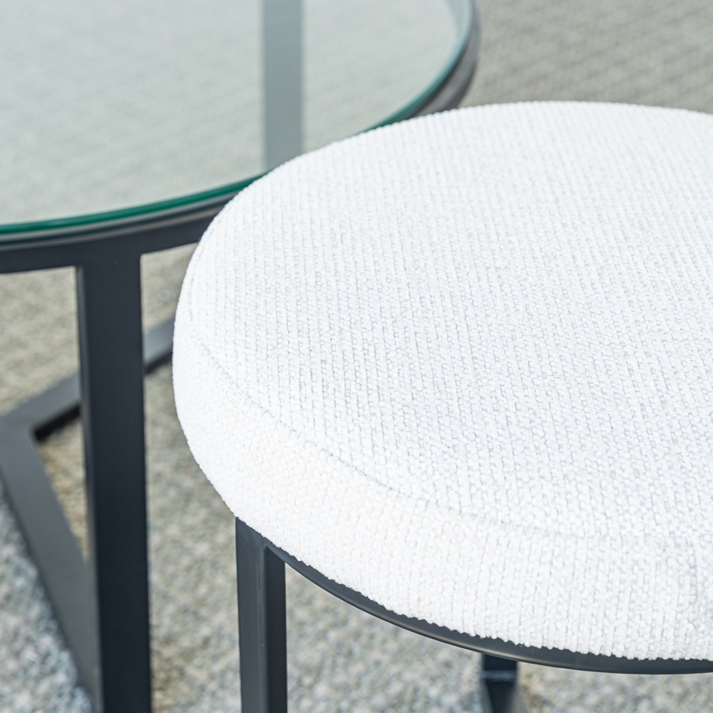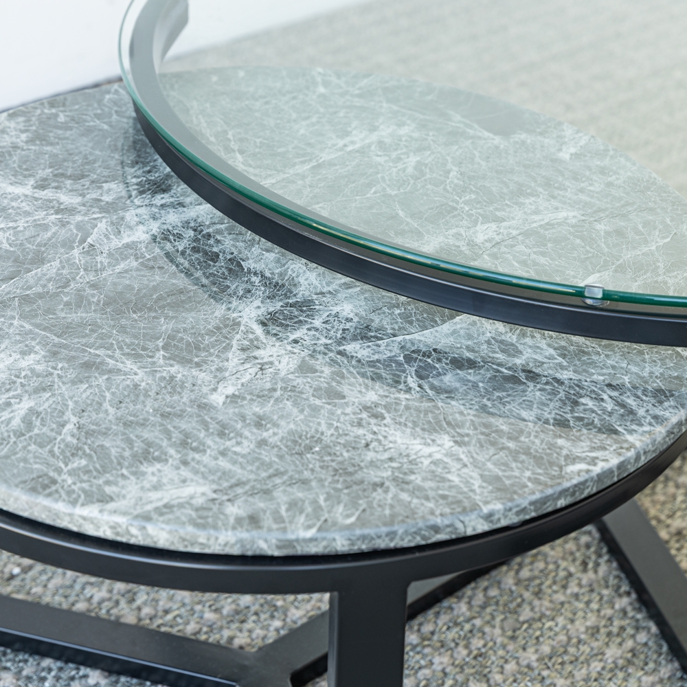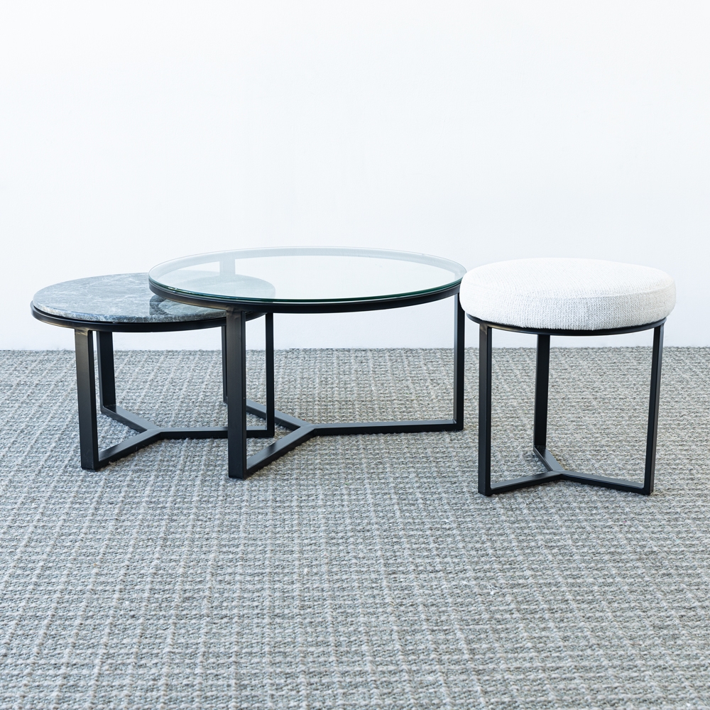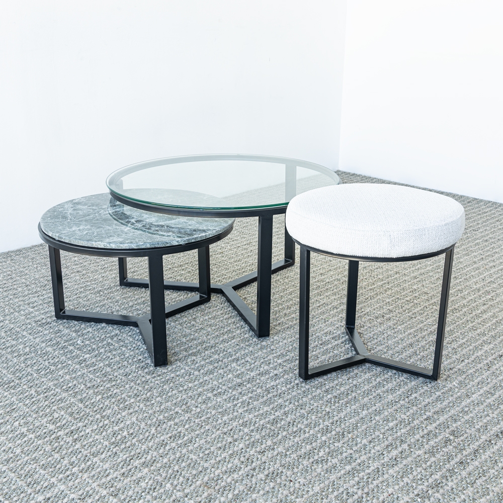 Este set de mesas fusiona vidrio, mármol y un práctico banco tapizado para ofrecer estilo y funcionalidad en un solo conjunto. Su estructura metálica aporta estabilidad y un toque moderno ideal para cualquier sala. Perfectas para crear composiciones dinámicas y aprovechar mejor tus espacios.