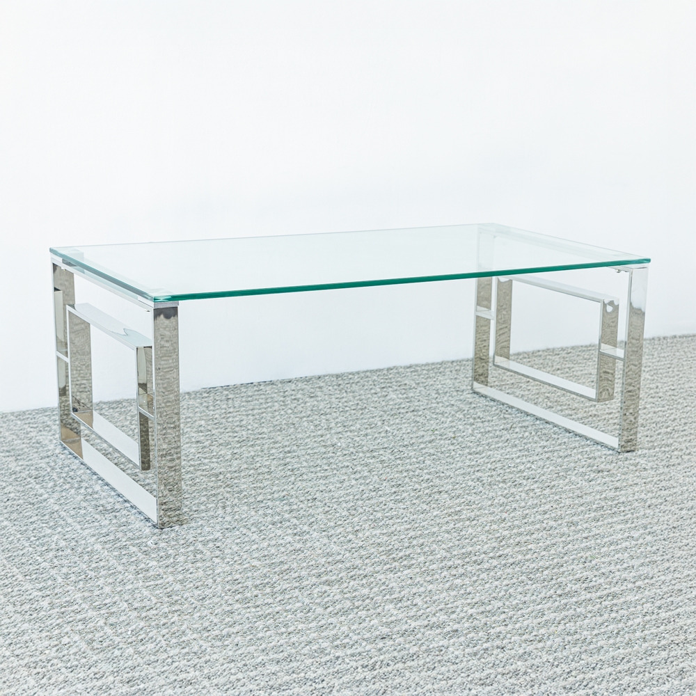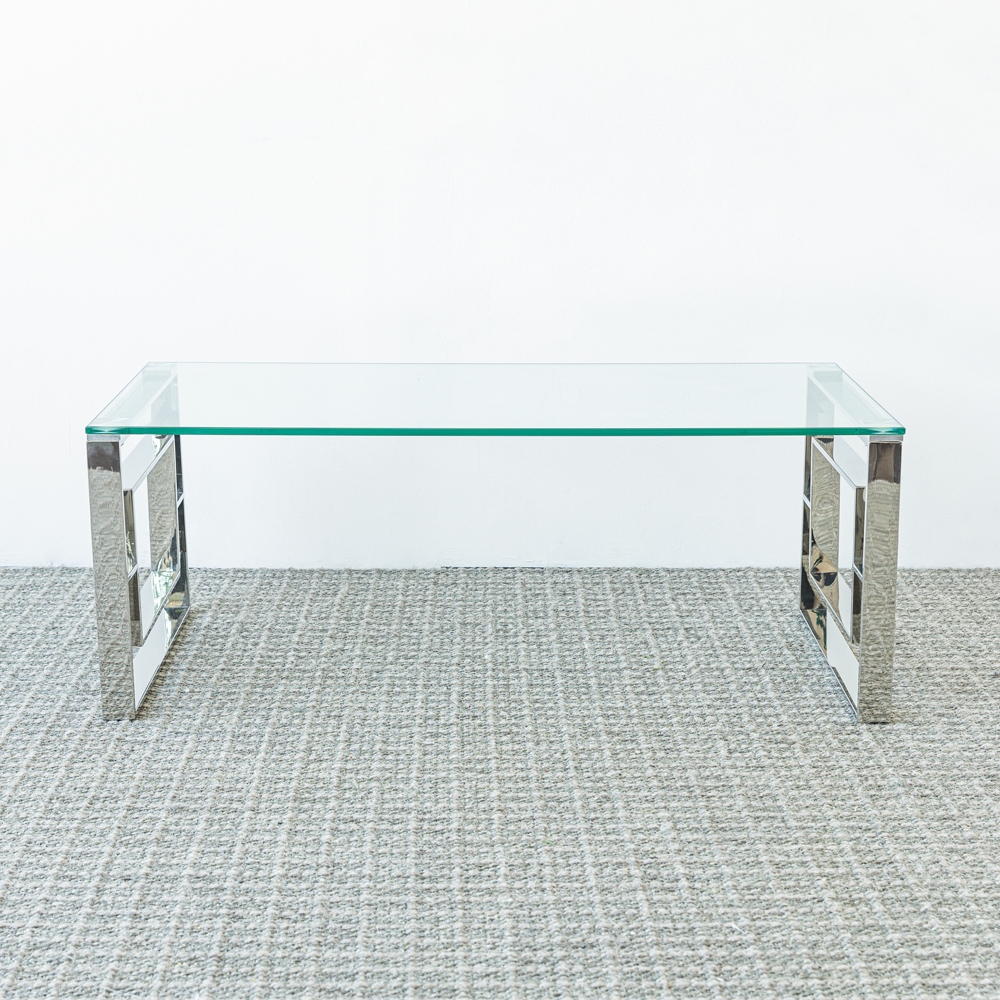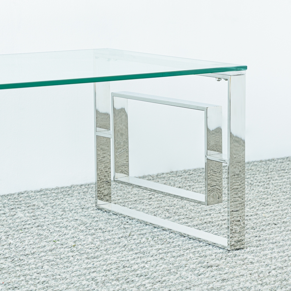 Esta mesa combina una elegante cubierta de vidrio templado con una base metálica cromada de diseño geométrico, creando un estilo moderno y sofisticado. Su estructura abierta aporta ligereza visual, ideal para ampliar y embellecer cualquier sala. Un acento decorativo que destaca por su brillo y transparencia.