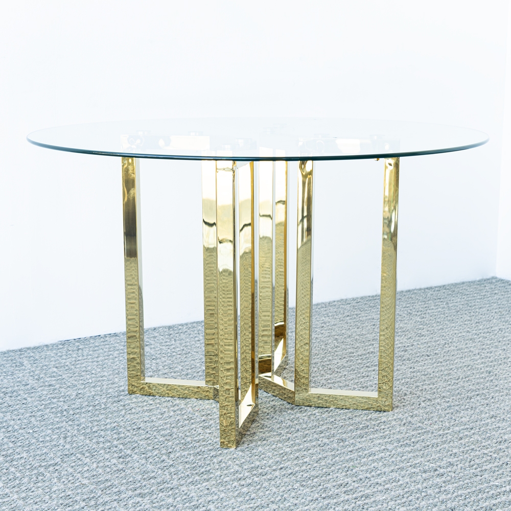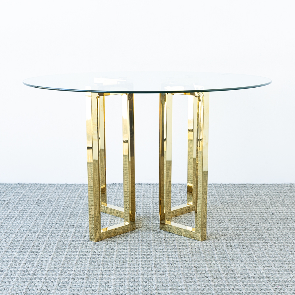 Mesa moderna con cubierta de vidrio templado y base metálica en acabado dorado brillante, diseñada para aportar elegancia y sofisticación. Su estructura geométrica crea un equilibrio perfecto entre estilo y funcionalidad. Ideal para salas, recibidores o espacios contemporáneos.
