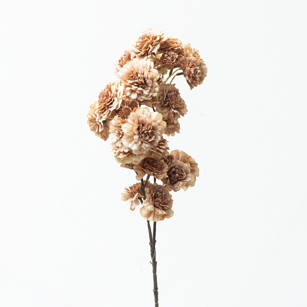 Rama floral decorativa artificial con flores en tonos beige y café. Pétalos abundantes que aportan textura y un estilo natural. Ideal para floreros, arreglos florales o decoración interior cálida y elegante.