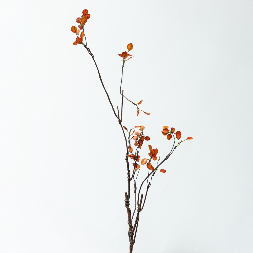 Rama decorativa artificial con hojas en tonos terracota y naranja. Diseño orgánico que aporta calidez y carácter al ambiente. Ideal para floreros altos, arreglos otoñales o acentos decorativos.