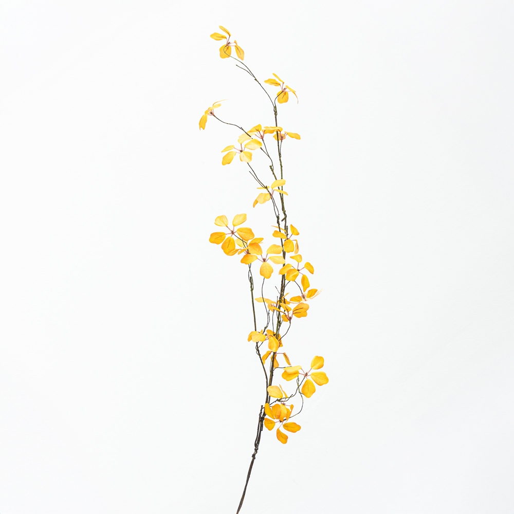 Rama decorativa artificial con hojas en tono amarillo mostaza. Diseño estilizado que aporta calidez y un acento natural al espacio. Ideal para floreros altos, arreglos modernos o decoración de temporada.