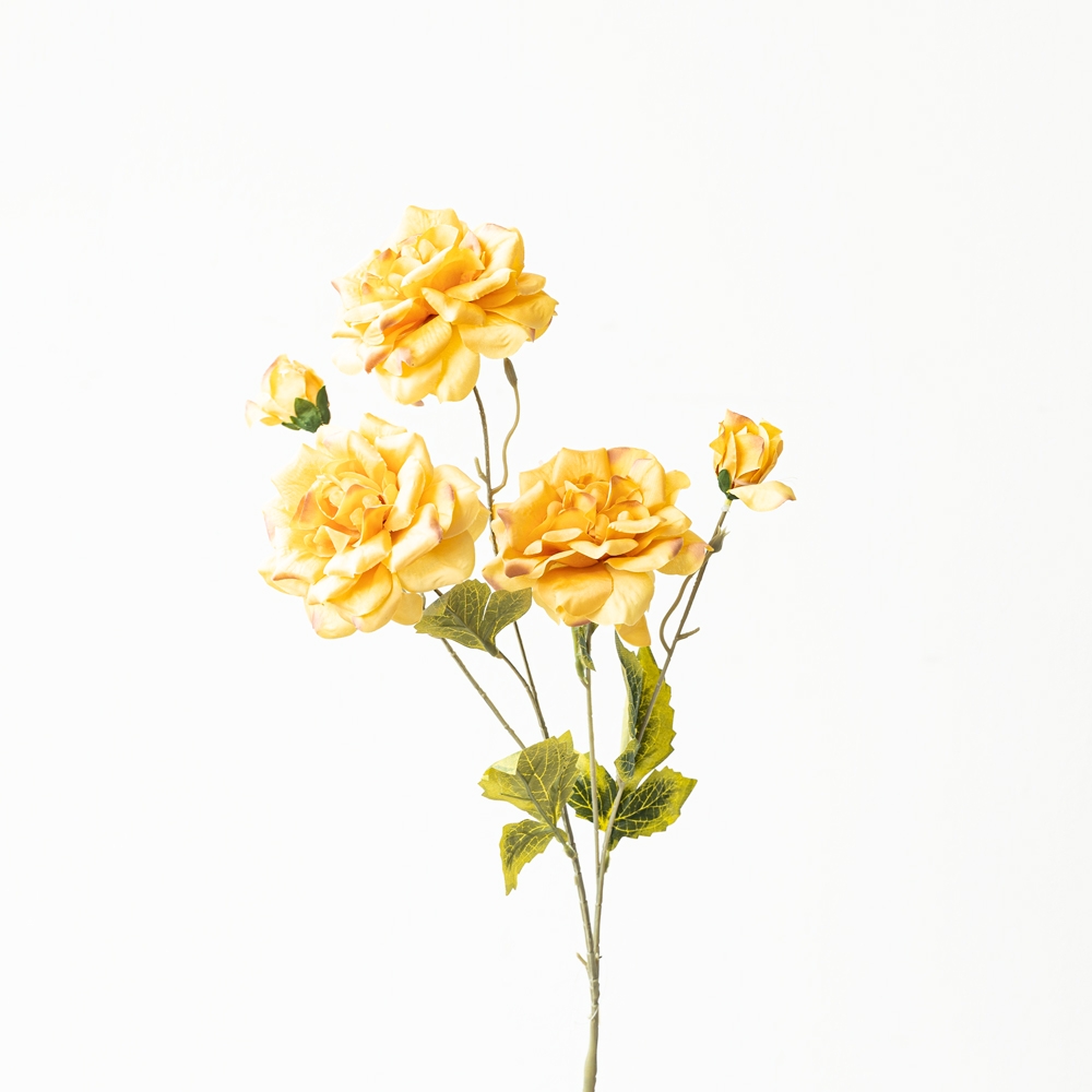 Rama artificial de rosas amarillas con pétalos detallados y hojas verdes que aportan un toque vibrante y elegante a cualquier espacio. Su diseño realista y tonos cálidos la hacen ideal para jarrones, arreglos florales o decoraciones especiales. Una pieza encantadora que ilumina y llena de vida tus ambientes.