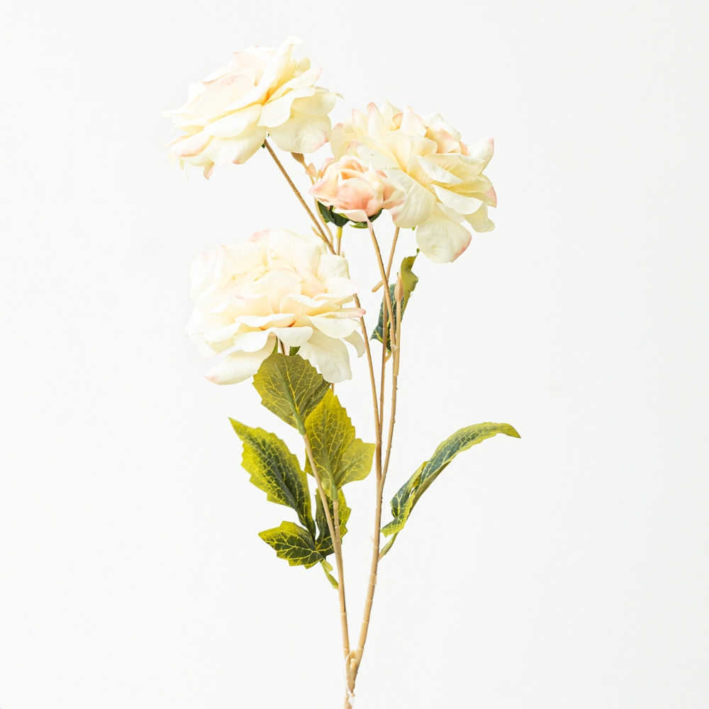Rama artificial de rosas en tonos crema con delicados matices rosados, diseñada para aportar elegancia y suavidad a cualquier ambiente. Sus pétalos detallados y hojas realistas crean un arreglo encantador y versátil. Perfecta para jarrones, centros de mesa o decoraciones florales permanentes.