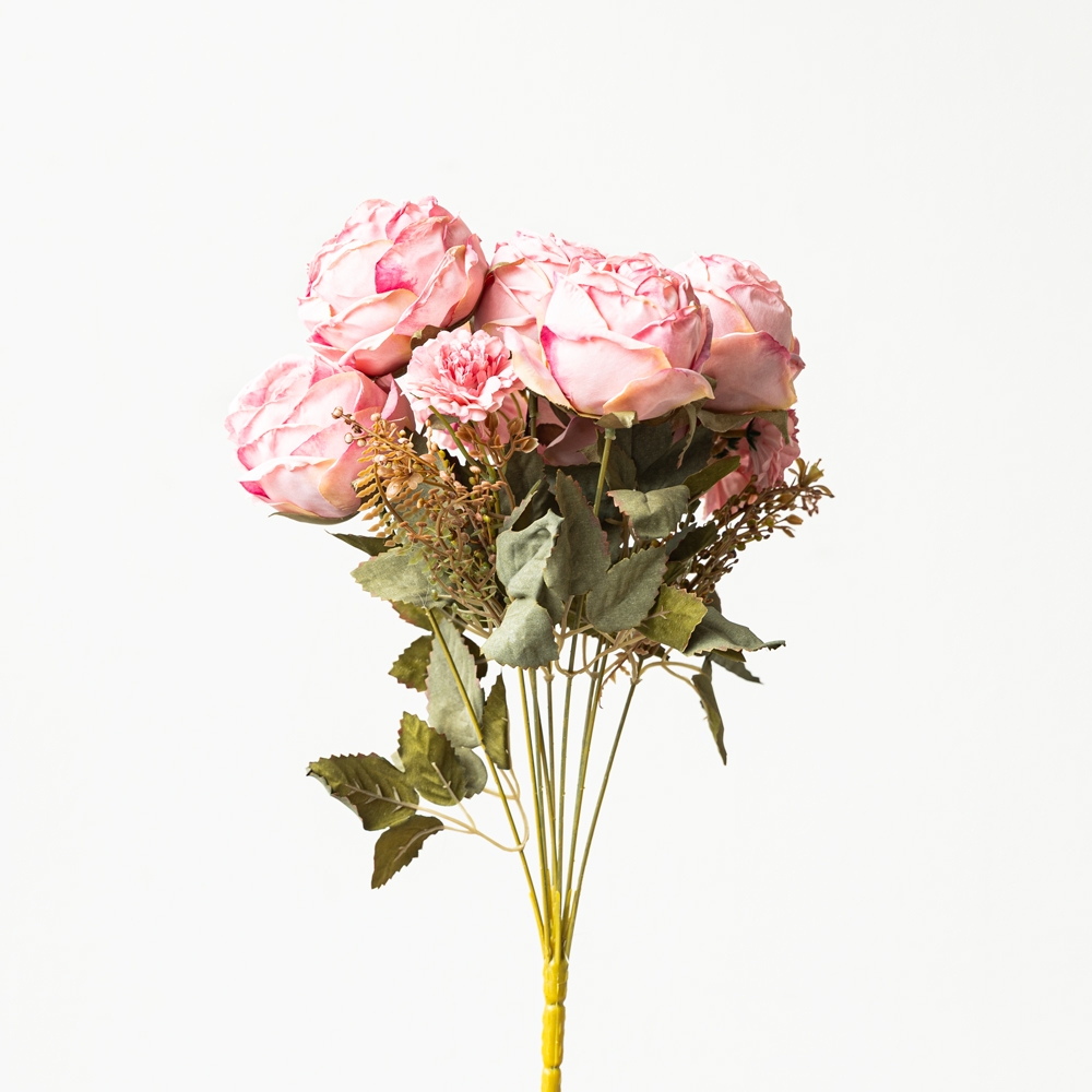 Ramillete artificial de rosas rosadas, con pétalos suaves y realistas que aportan un toque romántico y delicado a cualquier espacio. Incluye follaje y pequeños acentos florales que enriquecen su volumen y textura. Ideal para decorar jarrones, arreglos o ambientes que buscan una estética dulce y elegante.