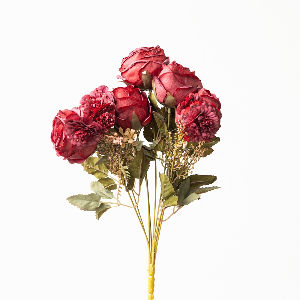 Ramillete artificial en tonos rojo vino que combina rosas y flores de textura abundante para un acabado elegante y sofisticado. Su follaje realista aporta profundidad y equilibrio al arreglo. Ideal para dar un toque cálido y romántico a jarrones, centros de mesa y rincones decorativos.