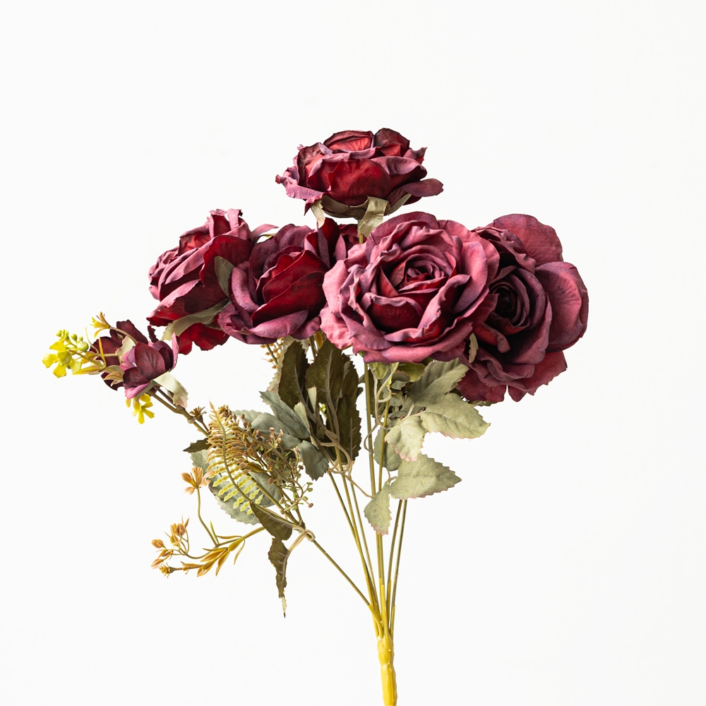 Ramillete artificial en tonos borgoña con rosas de pétalos amplios y textura realista que aportan un toque elegante y dramático a cualquier espacio. Incluye follaje y pequeñas flores complementarias que enriquecen su volumen y detalle. Perfecto para decorar jarrones, centros de mesa o ambientes que buscan un estilo sofisticado y cálido.