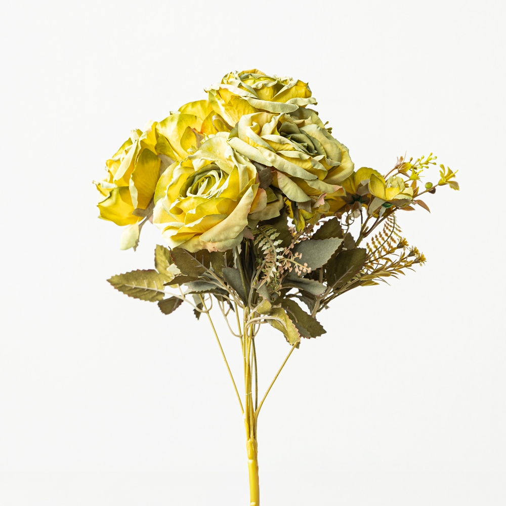 Ramillete artificial con rosas en tonos amarillo verdoso, ideal para añadir un toque vibrante y natural a cualquier espacio. Su composición incluye hojas y pequeños detalles florales que aportan textura y realismo. Perfecto para arreglos decorativos, jarrones o centros de mesa llenos de frescura.