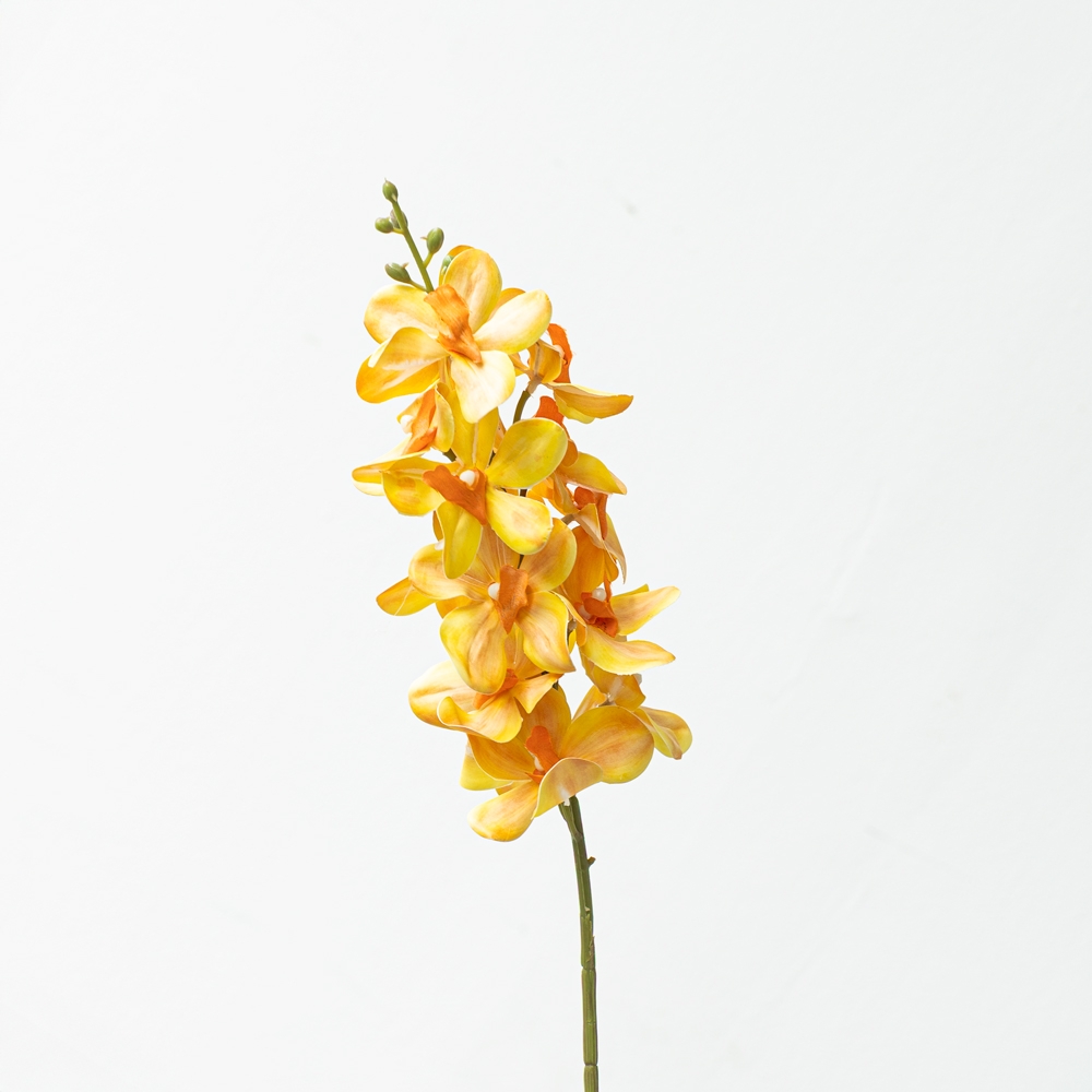 Rama floral con flores tipo orquídea en tonos amarillo y naranja que aportan calidez y vitalidad. Su diseño estilizado y elegante crea un efecto exótico y sofisticado. Ideal para decorar espacios con un toque moderno, fresco y lleno de vida.