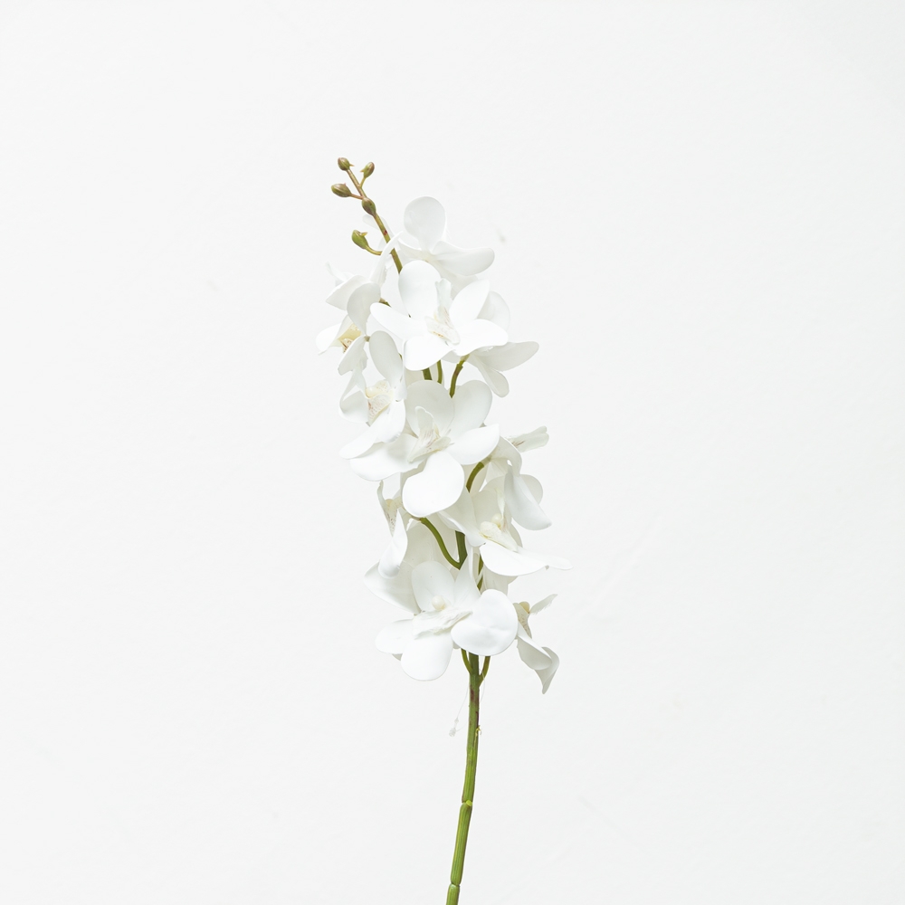 Rama decorativa tipo orquídea en color blanco puro, de estilo elegante y atemporal. Sus flores delicadas aportan luminosidad y un toque sofisticado al ambiente. Ideal para decorar interiores o complementar arreglos con un acabado limpio y refinado.