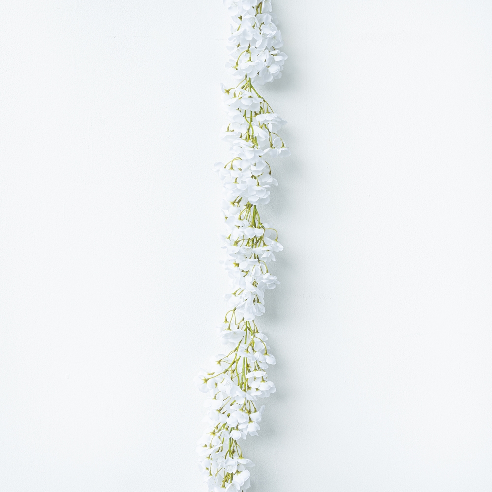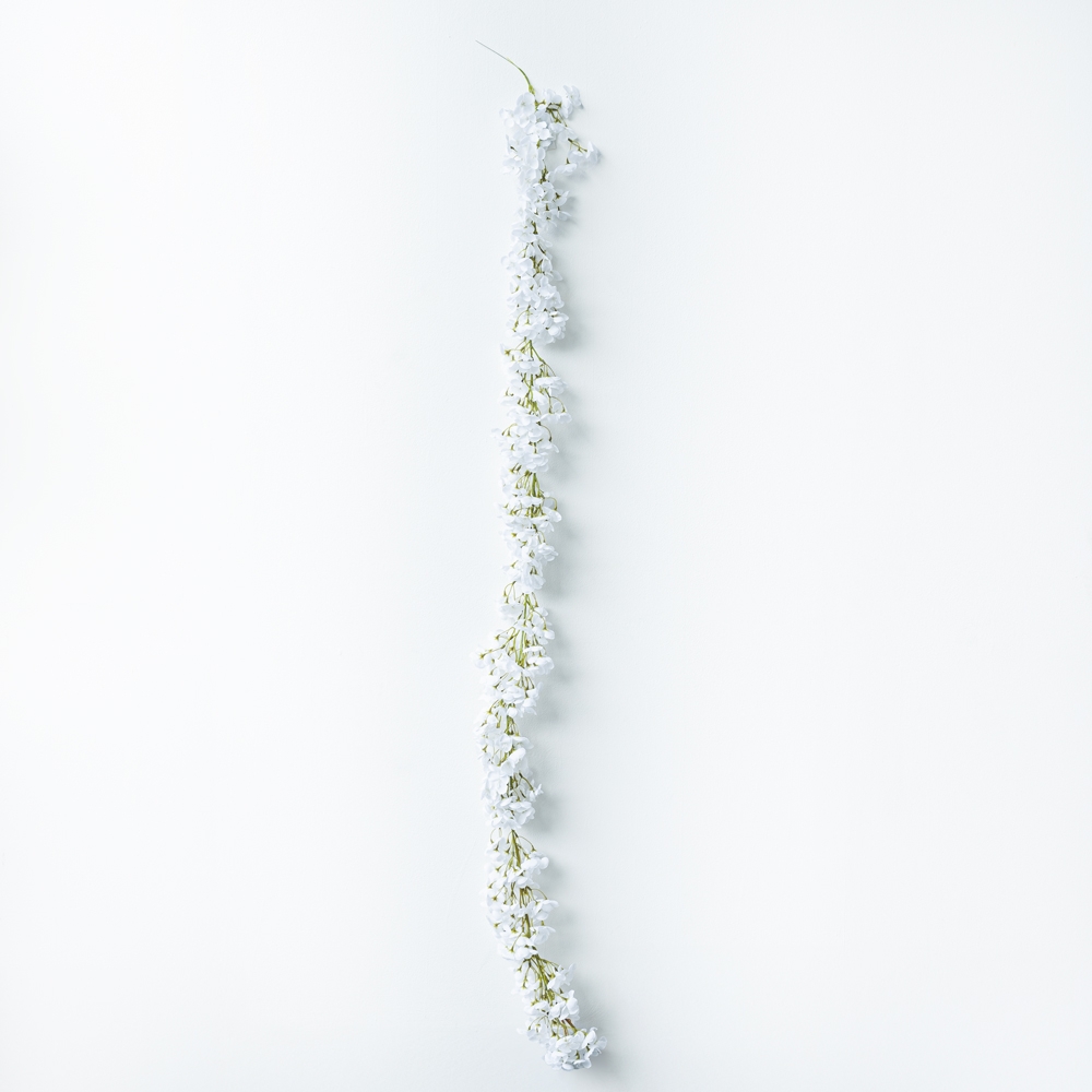 Guirnalda floral colgante con delicadas flores blancas de apariencia ligera y natural. Su diseño alargado y fluido aporta elegancia y movimiento a cualquier espacio. Ideal para decorar paredes, eventos o ambientes con un estilo sofisticado y minimalista.
