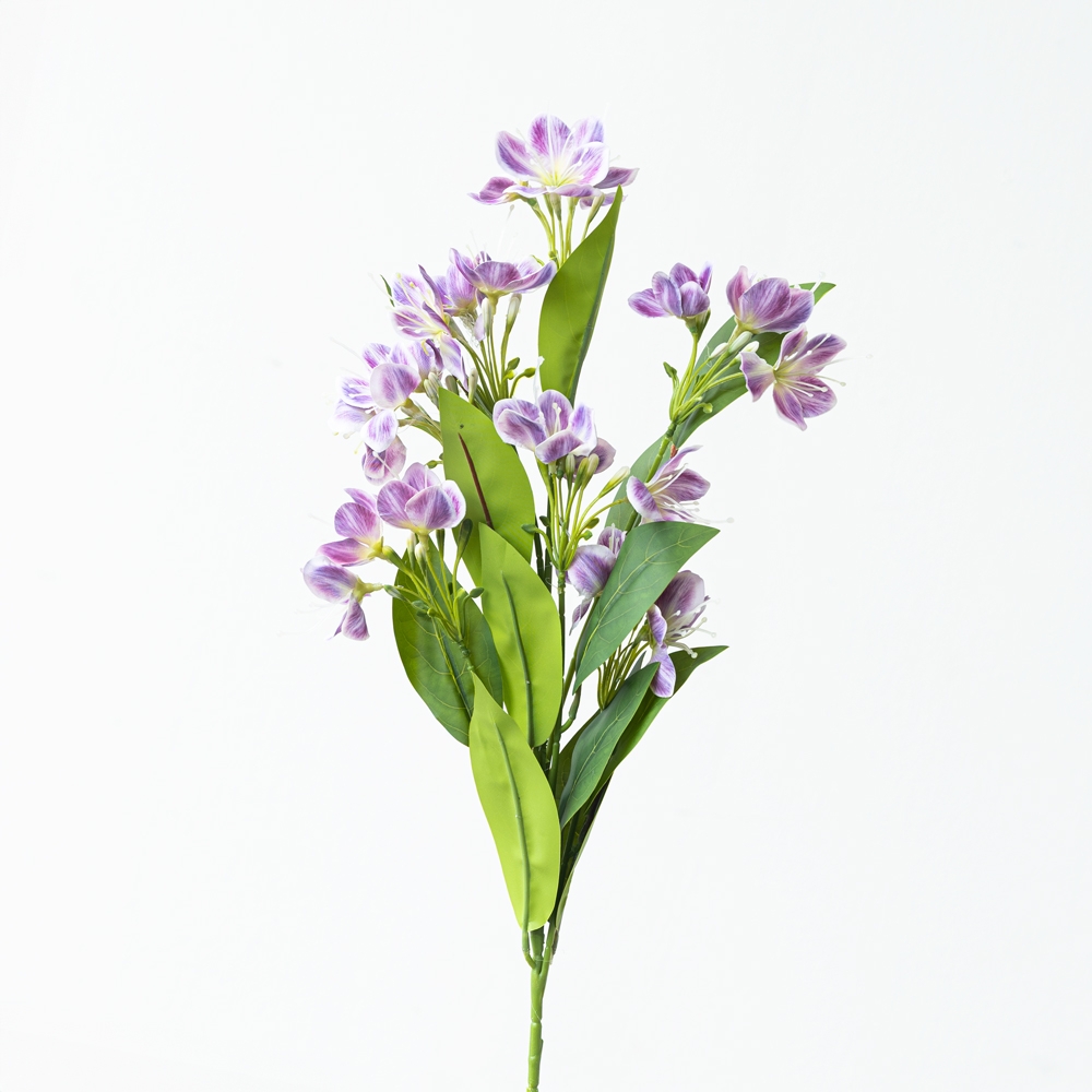 Ramo decorativo con delicadas flores en tonos lila y blanco, de apariencia fresca y natural. Sus hojas verdes estilizadas aportan un contraste elegante y armonioso. Ideal para decorar interiores o complementar arreglos con un toque suave y sofisticado.