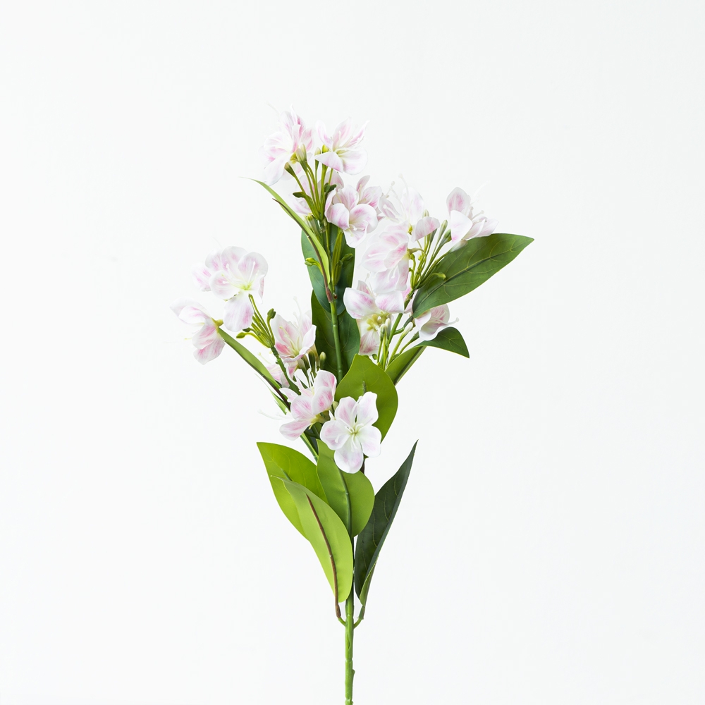 Ramo decorativo con flores en tonos blanco y rosa suave, de apariencia delicada y natural. Sus hojas verdes aportan frescura y un equilibrio armonioso al diseño. Ideal para decorar interiores o complementar arreglos con un toque elegante y sutil.