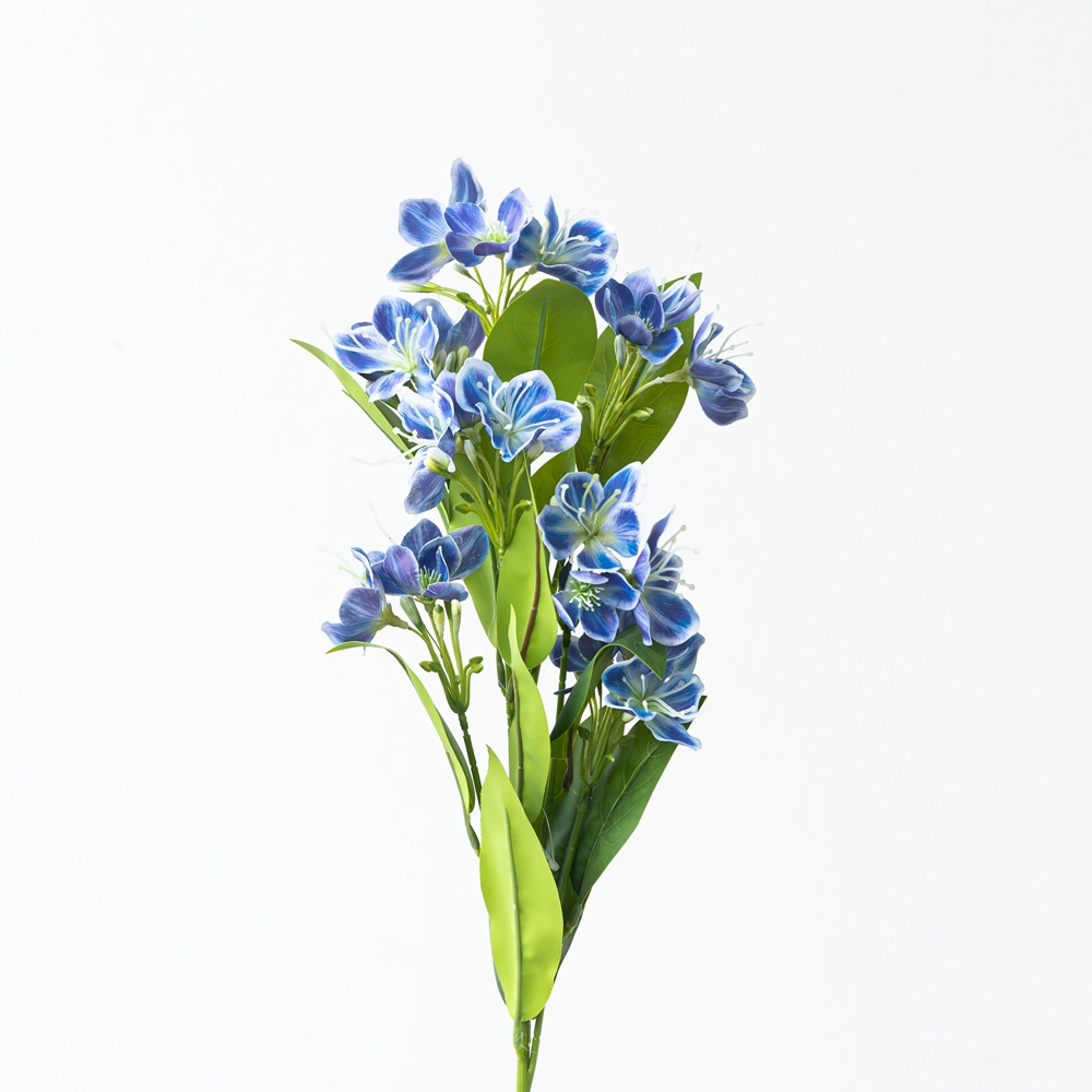 Ramo decorativo con flores en tonos azul profundo y detalles delicados que evocan frescura. Sus hojas verdes aportan contraste y realzan su apariencia natural y elegante. Ideal para decorar interiores o complementar arreglos con un toque moderno y sereno.