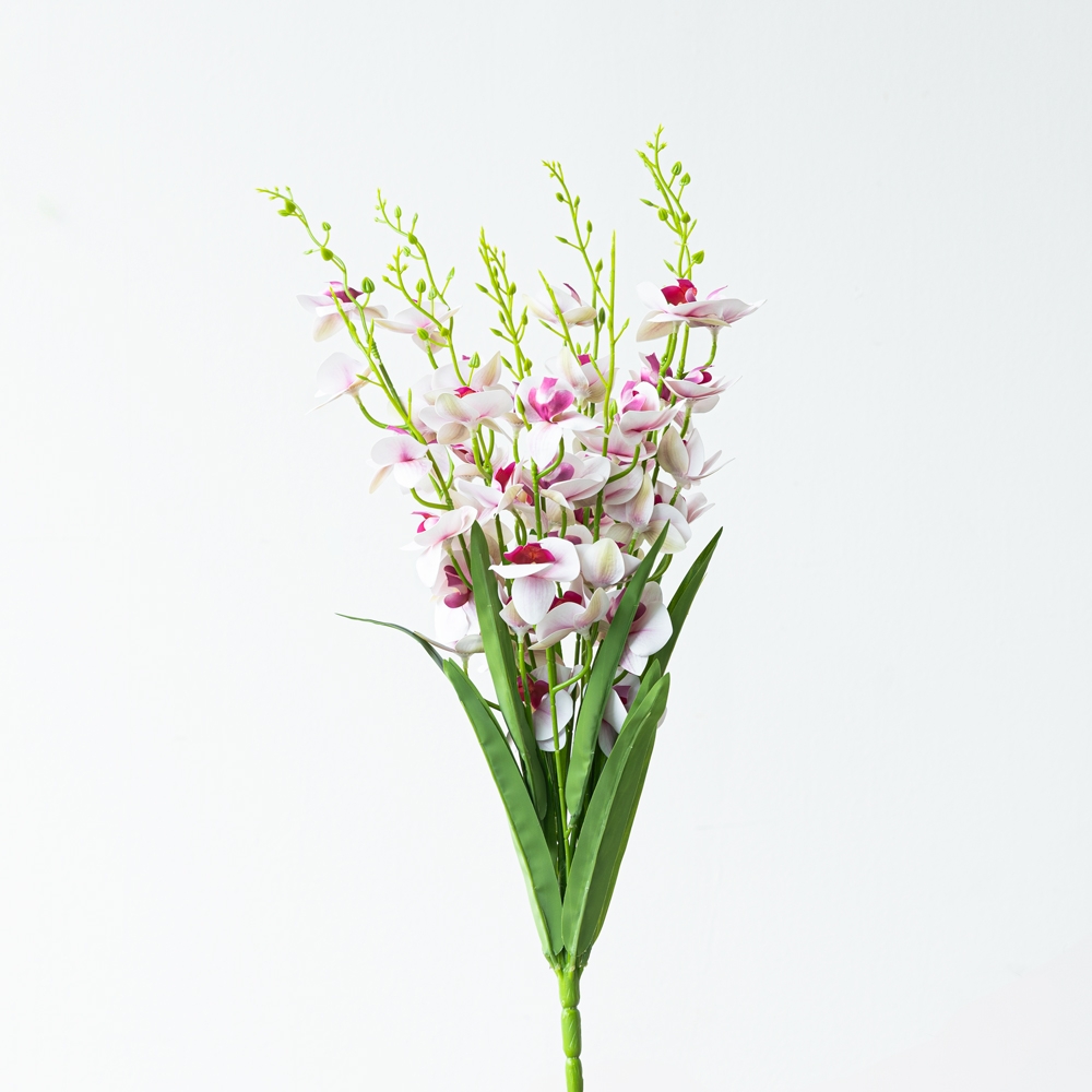 Ramo decorativo con delicadas flores tipo orquídea en tonos blanco y rosa, de apariencia elegante y natural. Sus tallos estilizados y detalles finos aportan un toque sofisticado a cualquier espacio. Ideal para complementar arreglos florales o decorar interiores con frescura y estilo.
