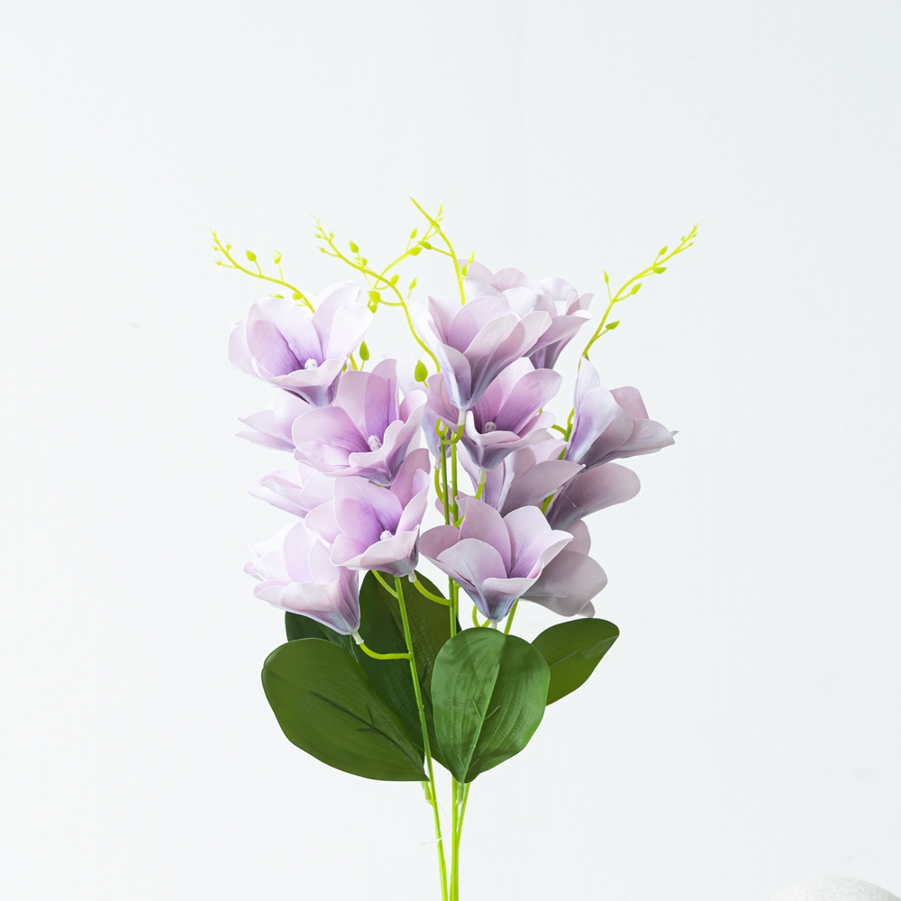 Ramo decorativo con flores en tono lila suave, de apariencia delicada y elegante. Sus pétalos estilizados y follaje verde crean un contraste armonioso y moderno. Perfecto para aportar un toque fresco y sofisticado a cualquier espacio interior.