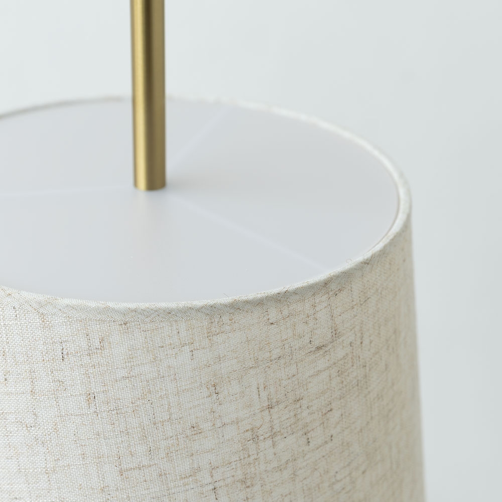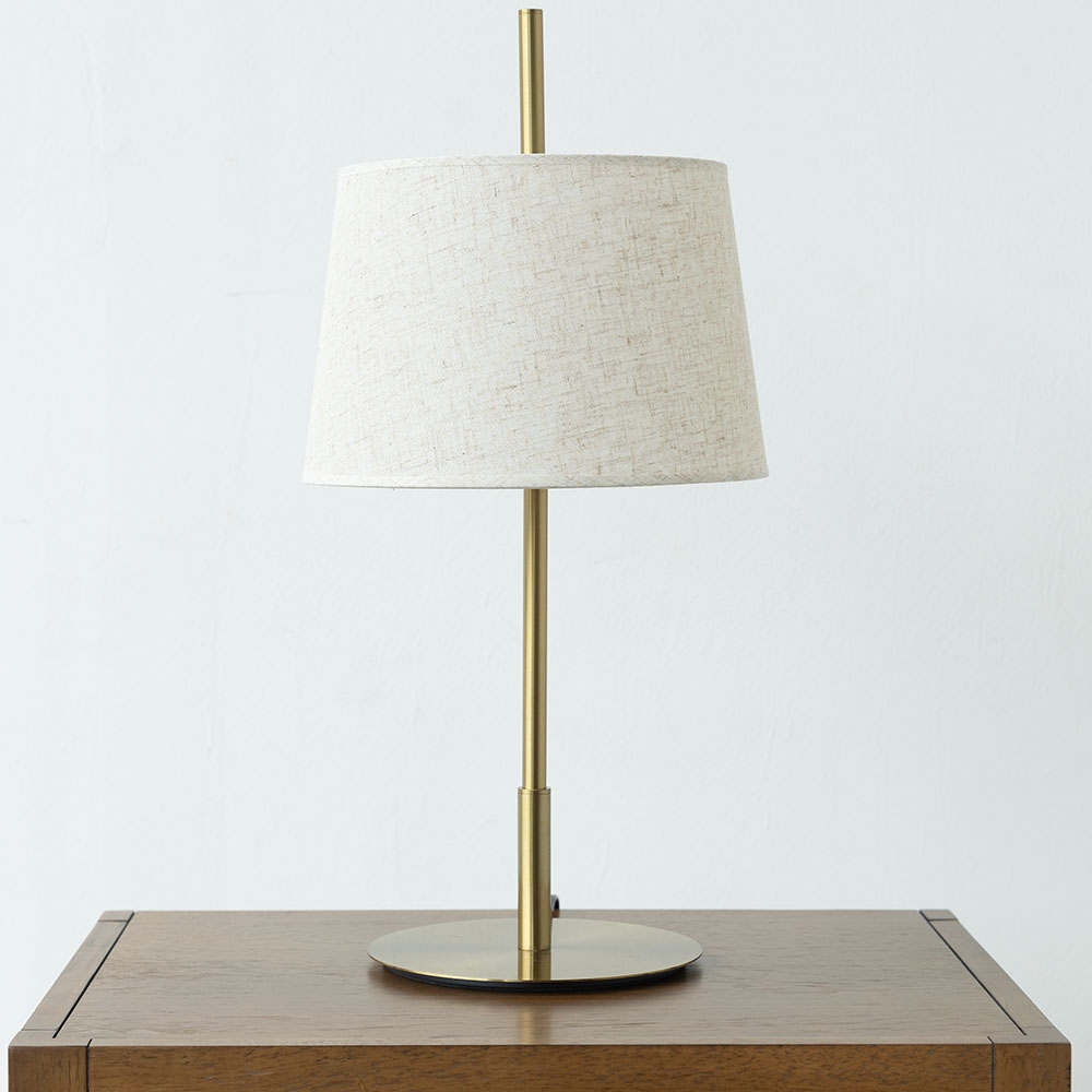 Lámpara de mesa elegante con base metálica en acabado dorado que aporta un toque sofisticado. Pantalla de tela en tono neutro que suaviza la luz y crea un ambiente cálido y acogedor. Ideal para complementar espacios contemporáneos con estilo y sencillez.