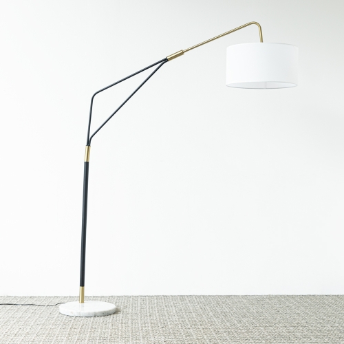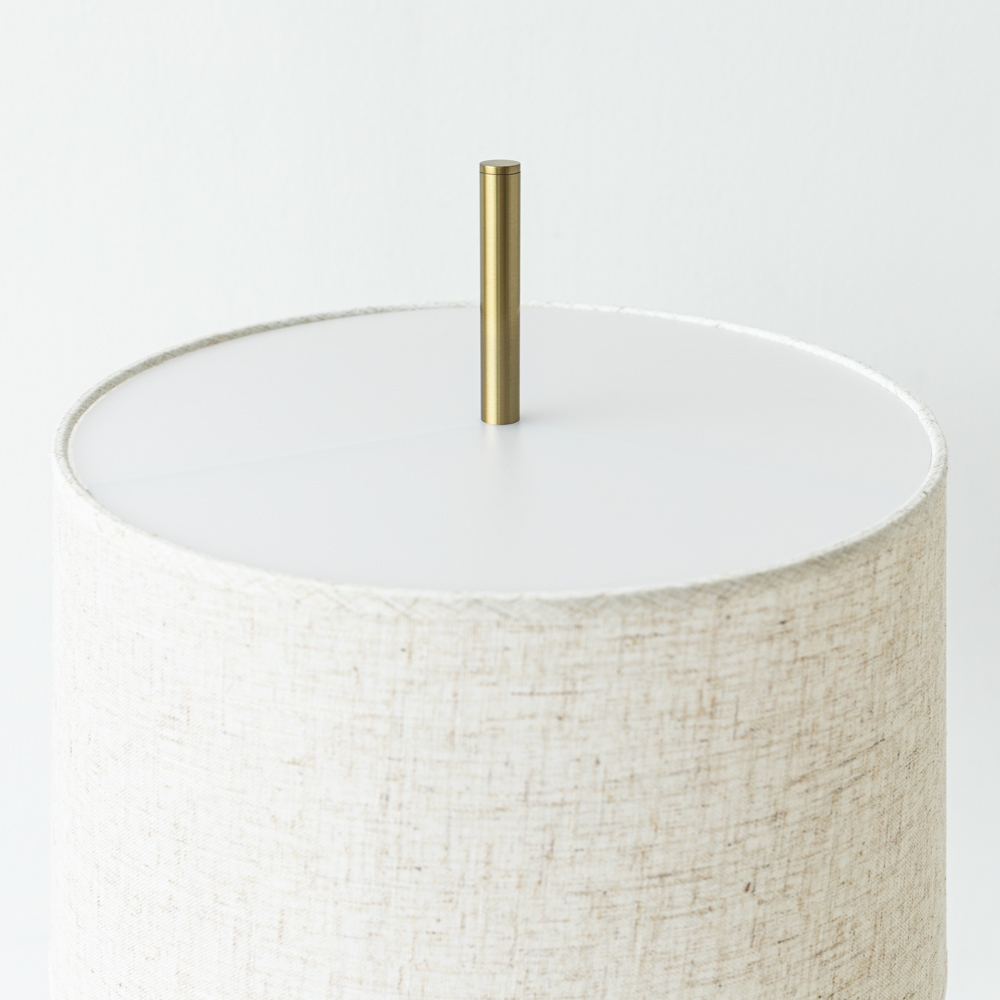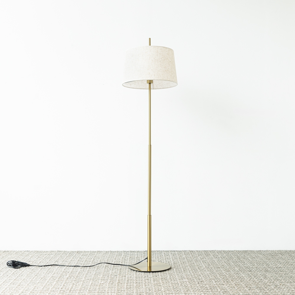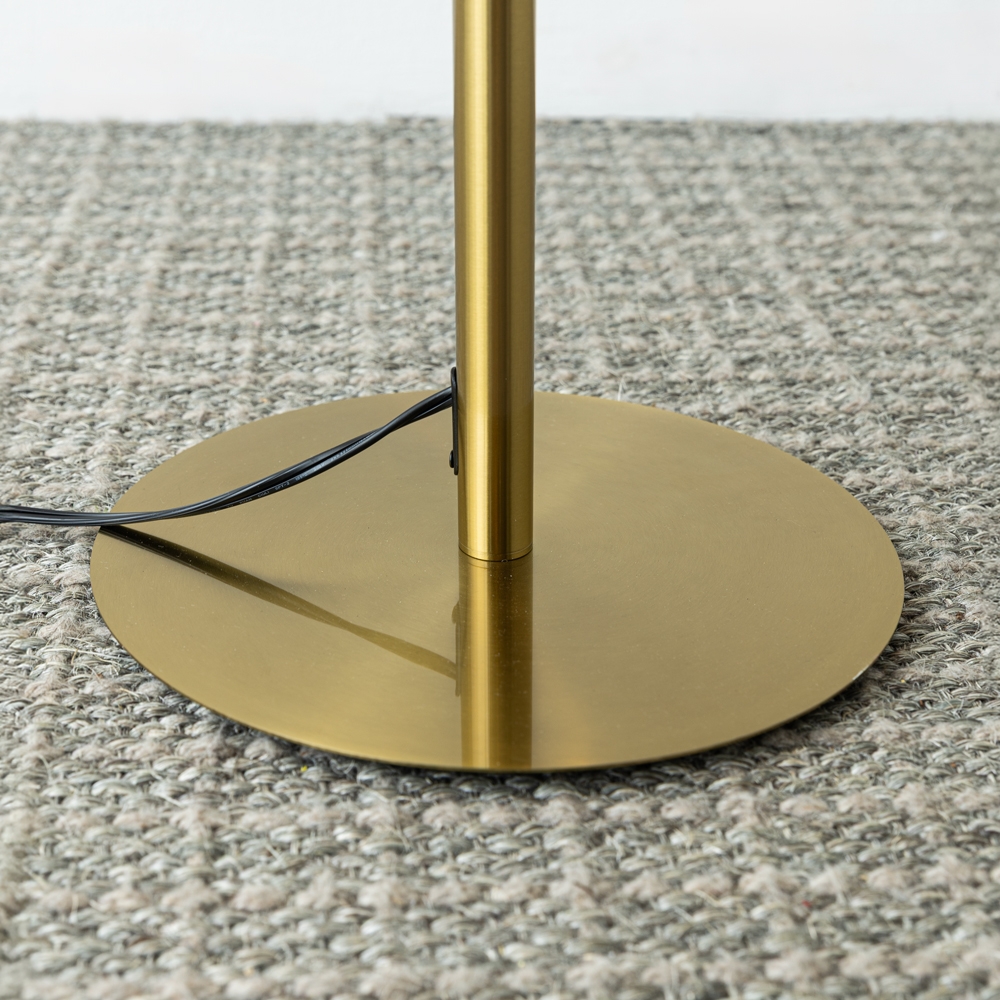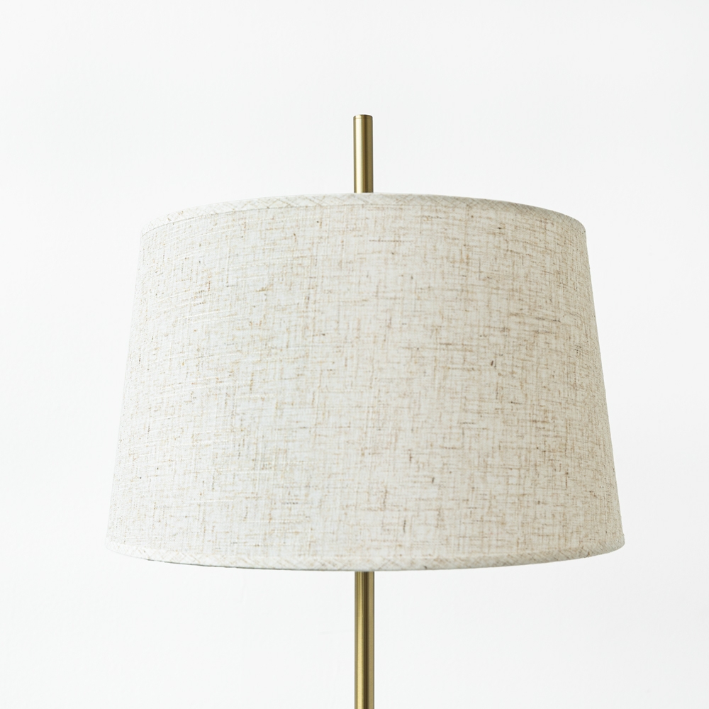 Lámpara de piso de diseño elegante con estructura metálica en acabado dorado. Pantalla de tela clara que brinda una iluminación cálida y envolvente. Ideal para salas, recámaras o espacios que buscan un toque sofisticado.