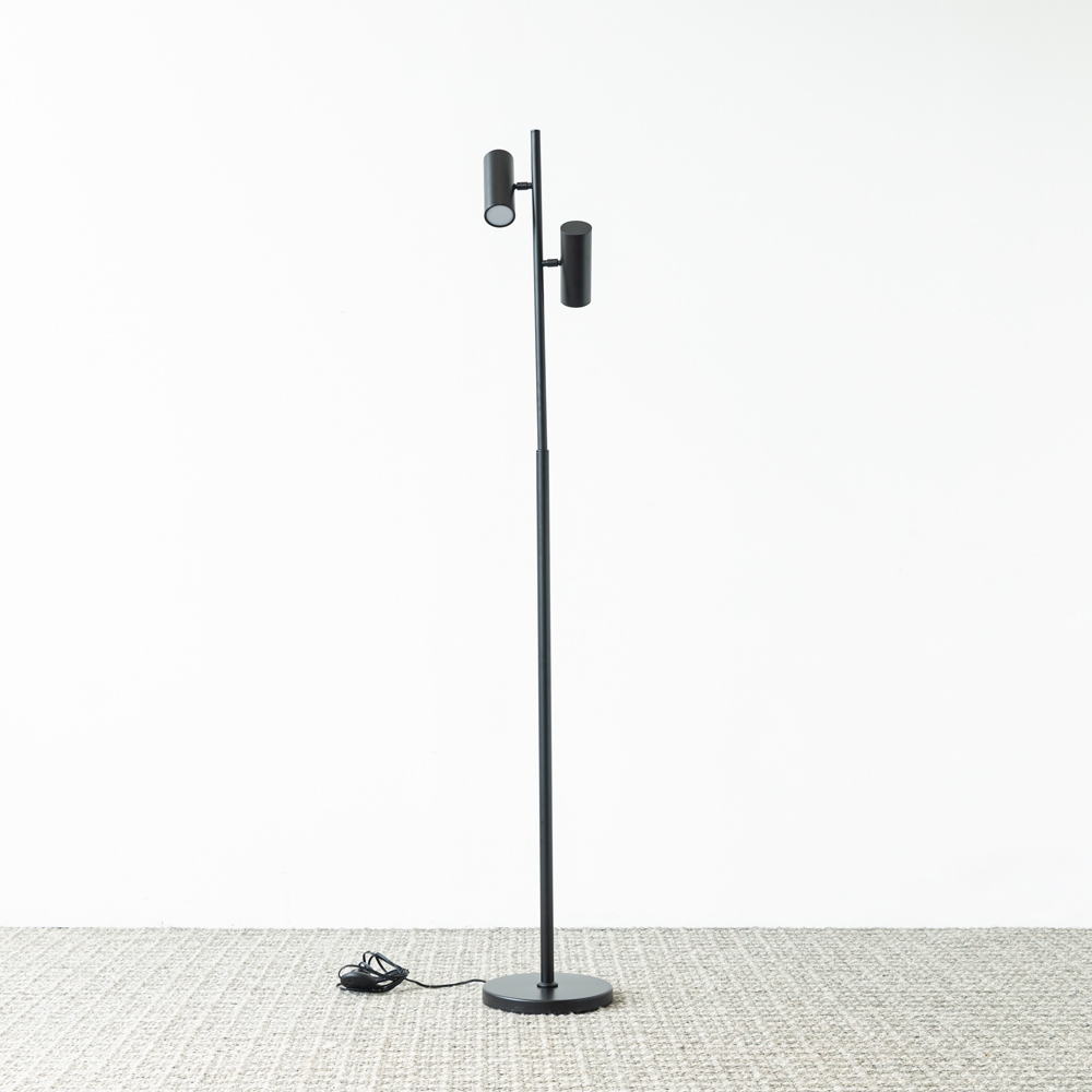 Lámpara de piso de diseño minimalista con doble foco orientable. Acabado negro mate y líneas limpias que aportan un estilo moderno. Ideal para iluminación funcional y decorativa en salas o recámaras.