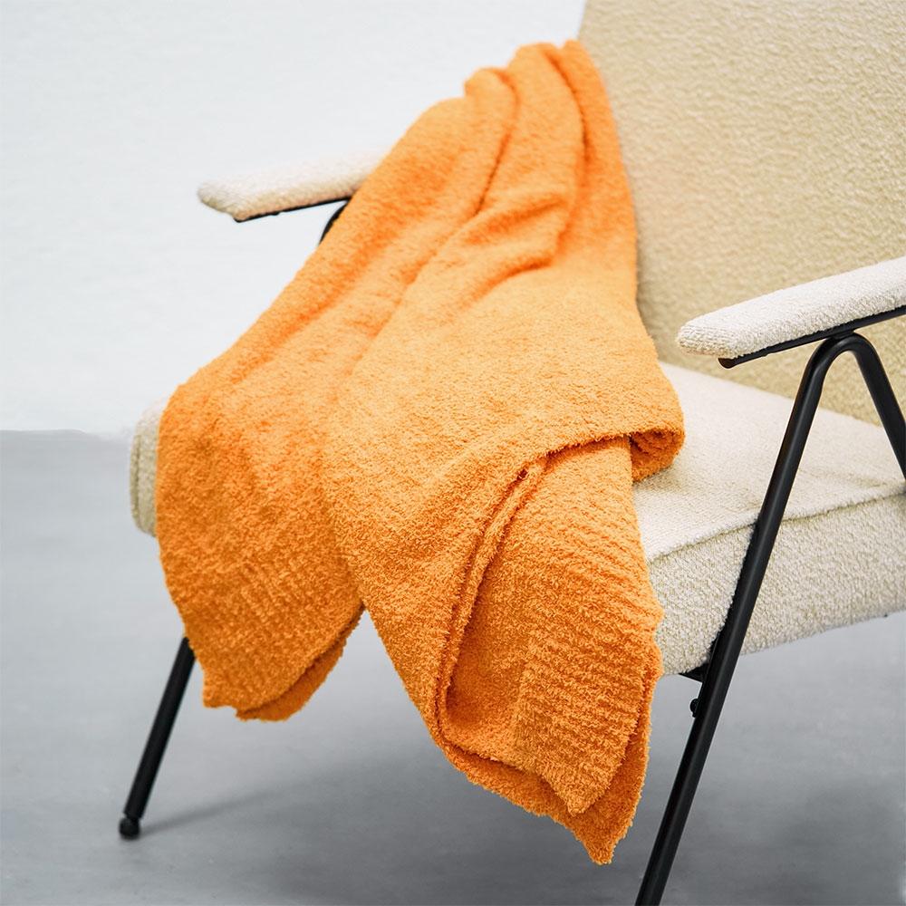 Throw de textura suave en tono naranja vibrante que aporta calidez y energía al espacio. Cuenta con un acabado bouclé ideal para mayor confort y sensación acogedora. Perfecto para sofás o sillones, añadiendo un toque moderno y lleno de color.