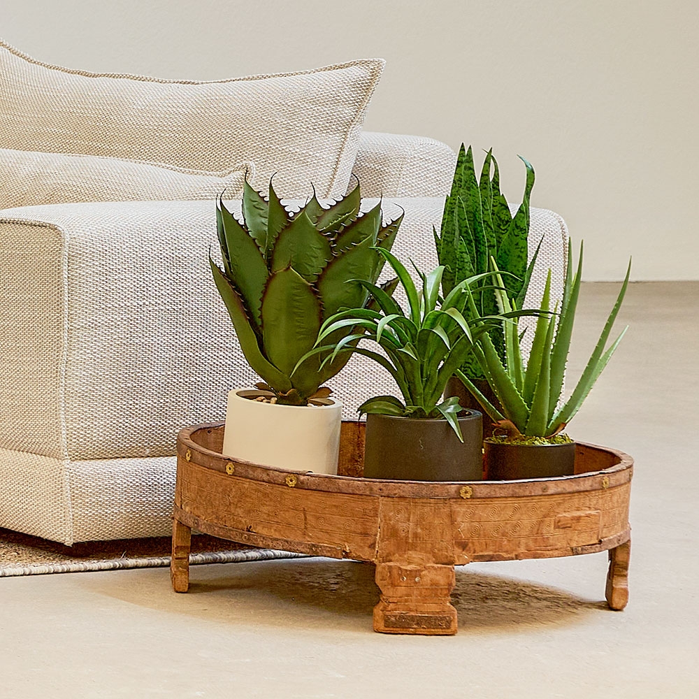 Base de maceta de madera artesanal con diseño bajo y circular, ideal para resaltar plantas decorativas.