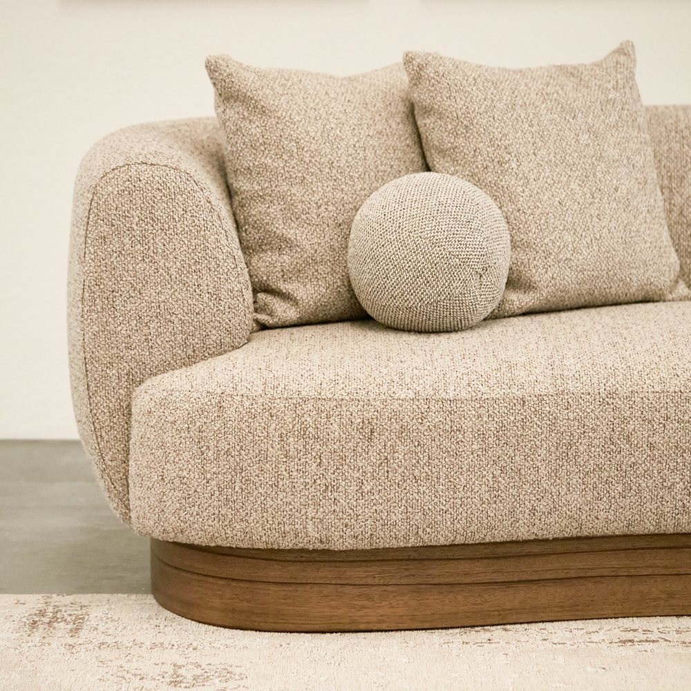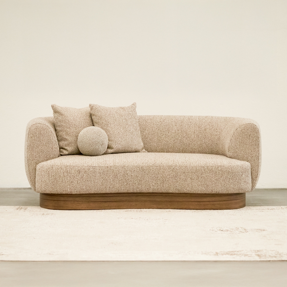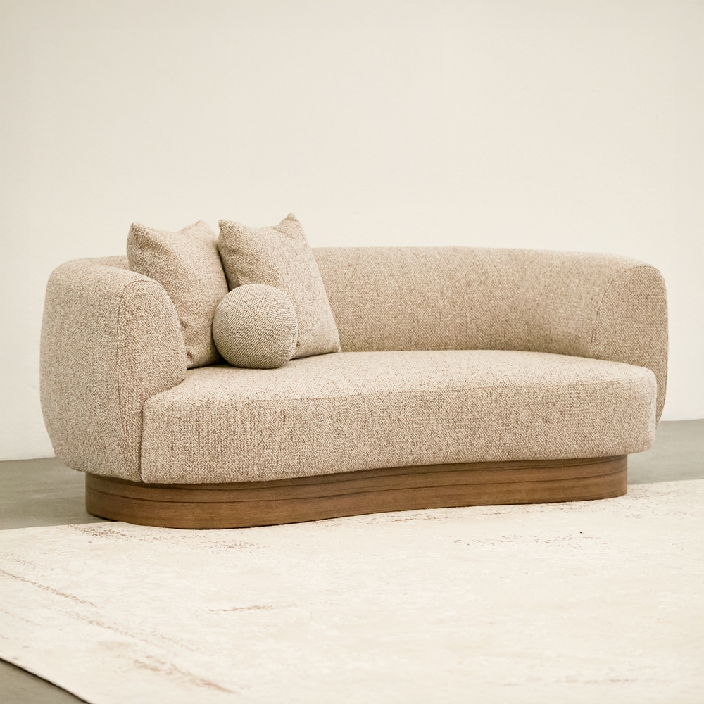 Loveseat de diseño curvo con tapizado en textura tipo bouclé en tono beige, suave y acogedor. Su base de madera aporta calidez y un contraste elegante. Ideal para crear un espacio sofisticado y contemporáneo en tu sala.