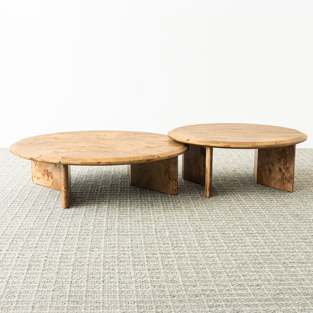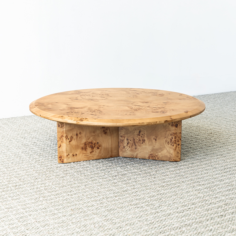 Mesa de centro redonda con diseño bajo y robusto. Combina una superficie amplia con una base escultórica de líneas orgánicas. Ideal para espacios modernos que buscan un toque artesanal y elegante.